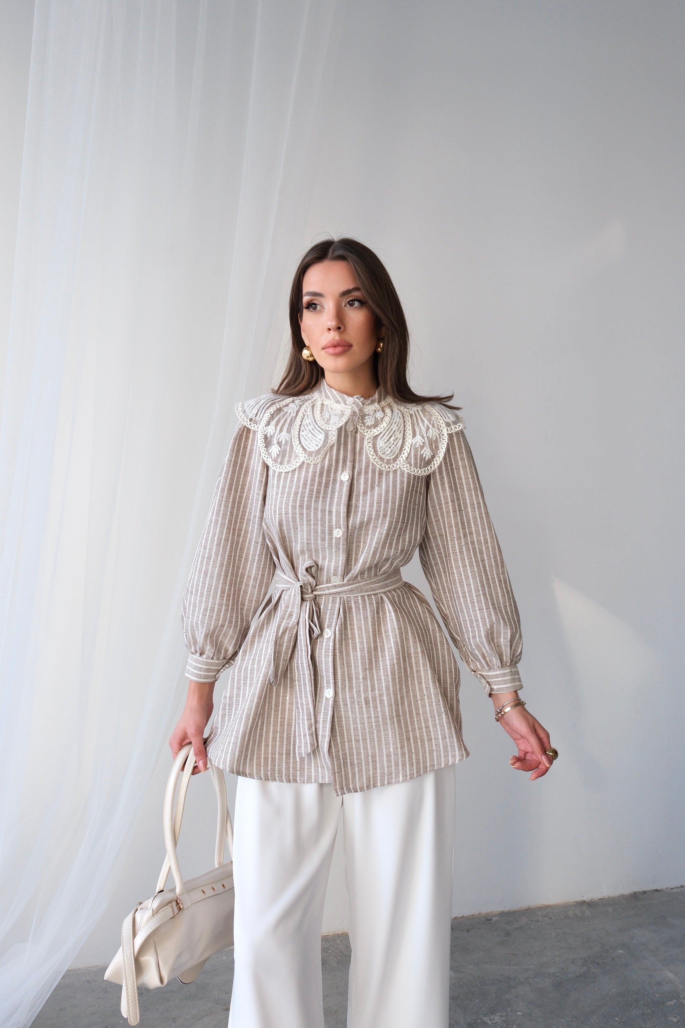 Dantel Yakalı Çizgili Kuşaklı Uzun Kollu Tunik - Vizon