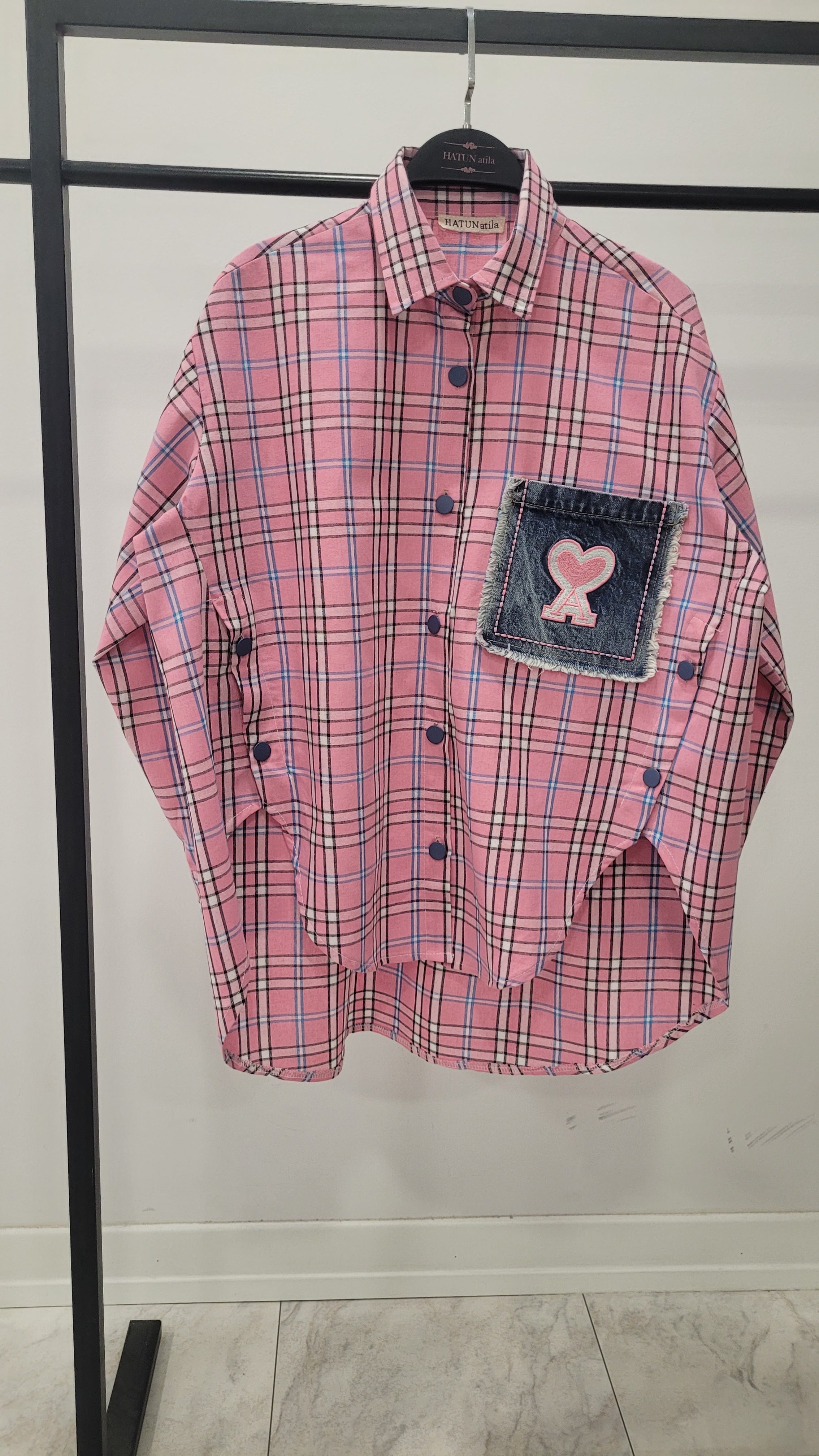 Denim Kalp Yamalı ve Düğme Detaylı Oversize Ekose Gömlek 8599 - Pembe