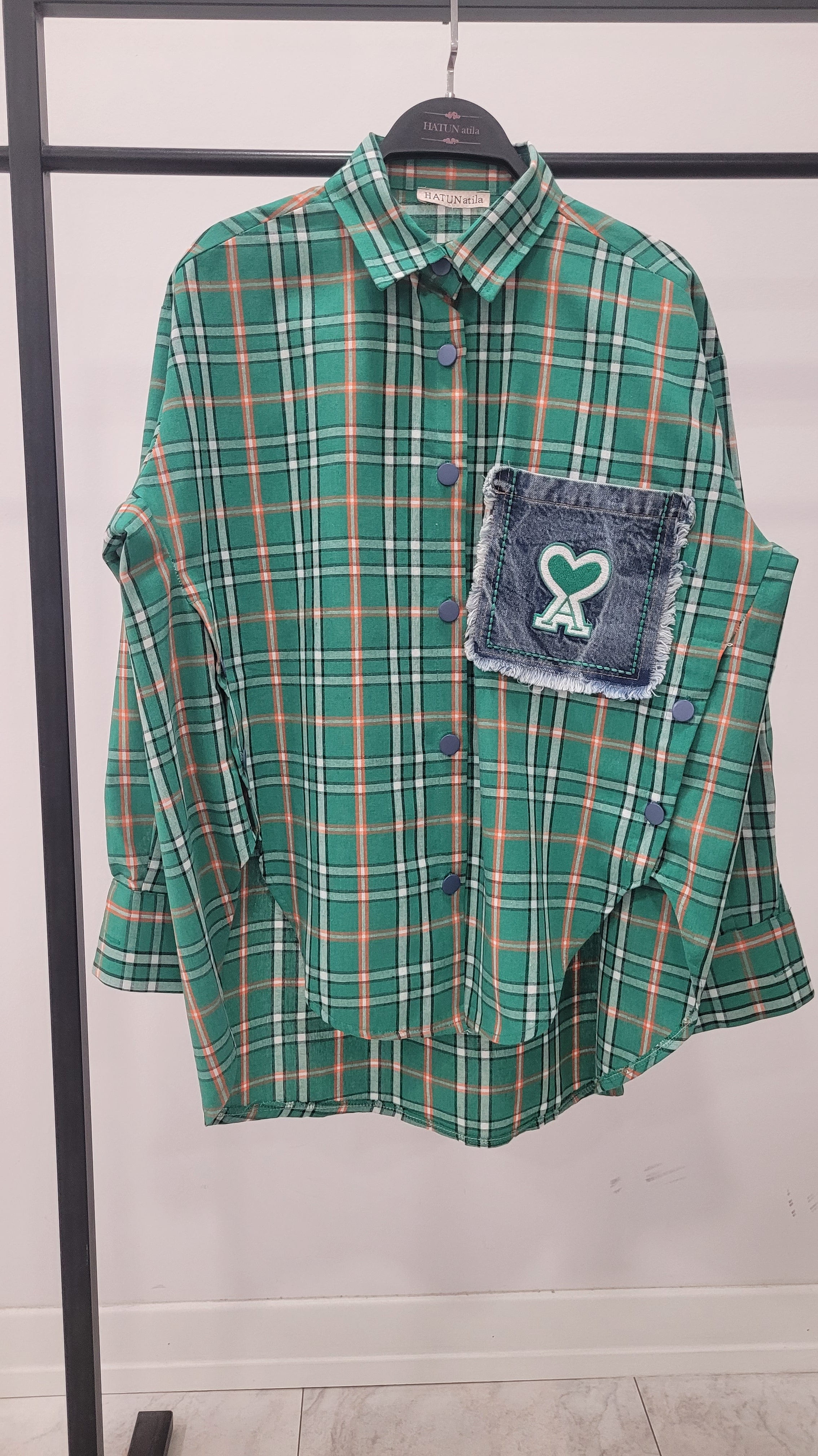 Denim Kalp Yamalı ve Düğme Detaylı Oversize Ekose Gömlek 8599 - Yeşil