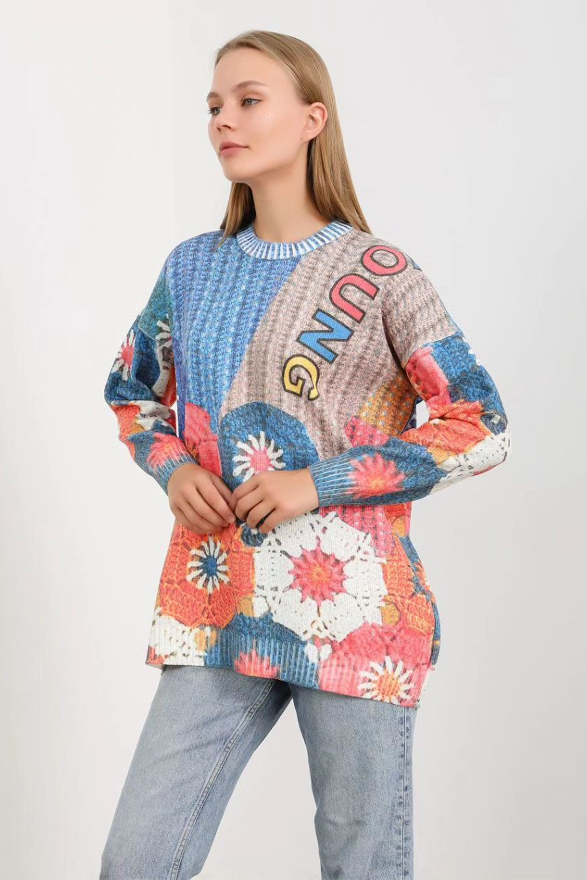 Desenli Bisiklet Yaka Kot Kollu Uzun Kazak - 4769-50