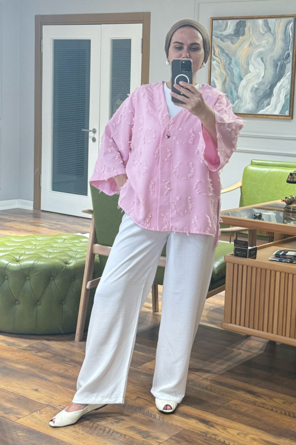 Dokulu V Yaka Tek Düğmeli Ceket ve Geniş Paça Pantolonlu İkili Takım 8883 - Pembe