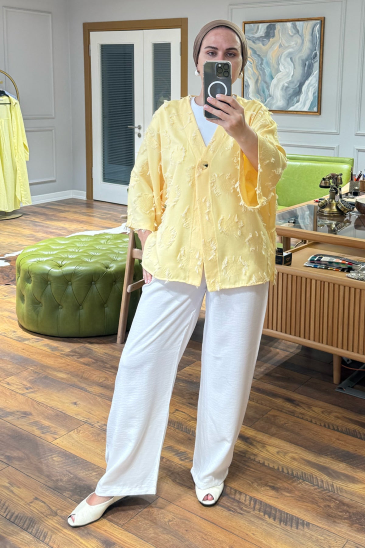 Dokulu V Yaka Tek Düğmeli Ceket ve Geniş Paça Pantolonlu İkili Takım 8883 - Sarı