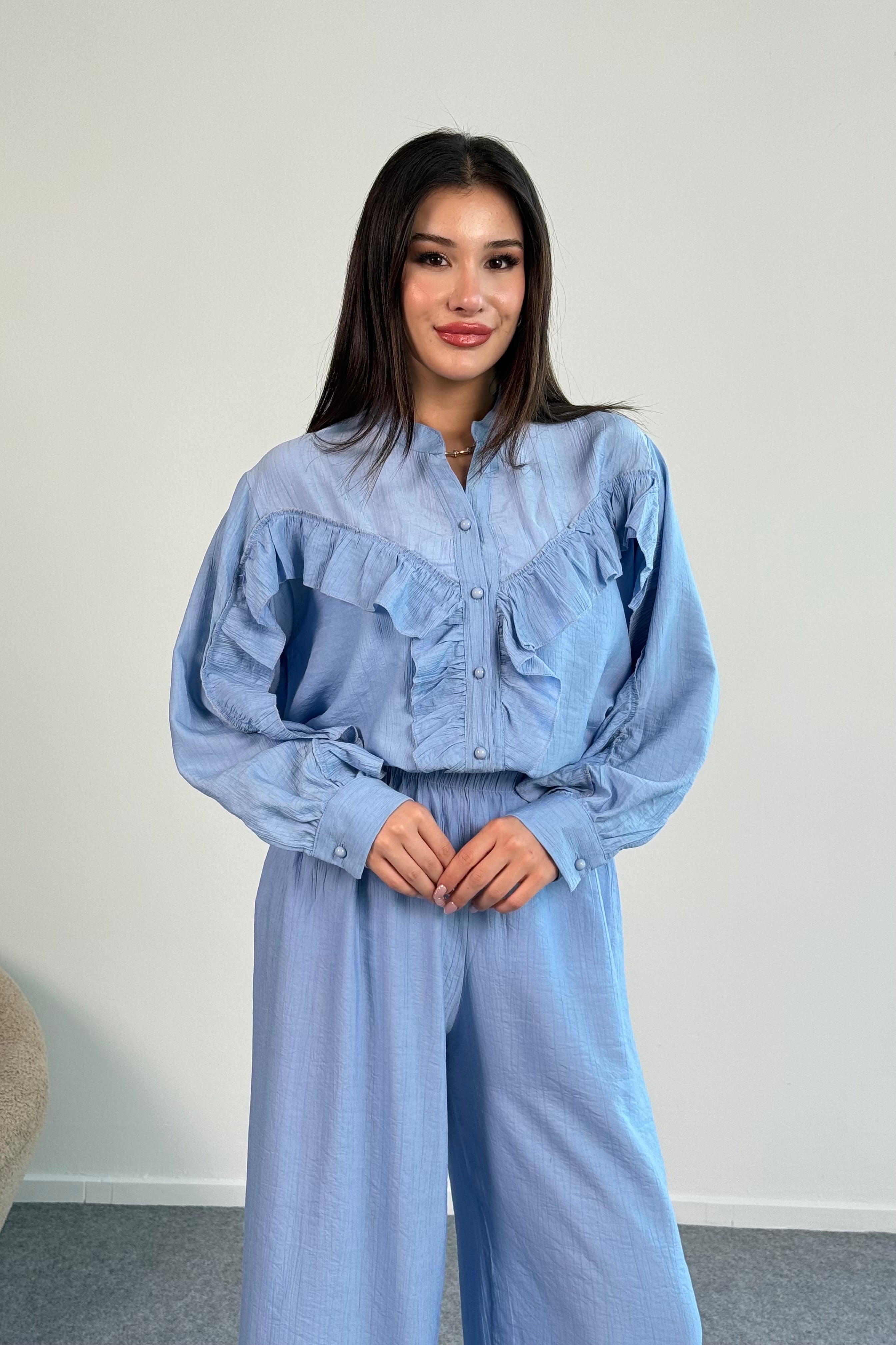 Fırfır Detaylı Uzun Kollu Gömlek ve Geniş Paça Pantolon İkili Takım 8021 - Mavi