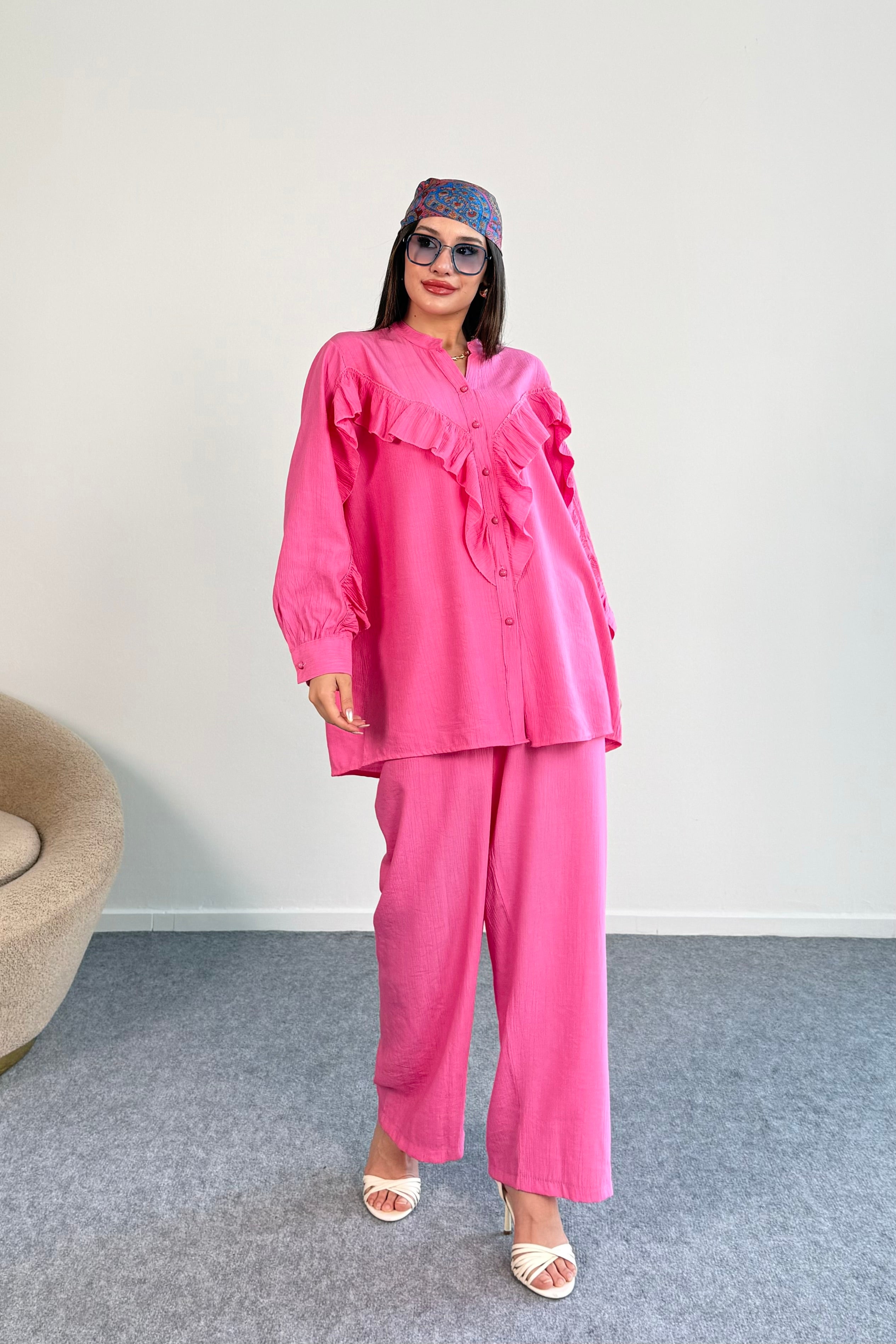 Canlı ve şık bir stil sunan Fırfır Detaylı Uzun Kollu Gömlek ve Geniş Paça Pantolon İkili Takım, gardırobunuzun en enerjik parçalarından biri olmaya aday. Göz alıcı fuşya pembe rengi pozitif bir hava yaratırken, gömleğin ön kısmındaki kat kat fırfır detayları ve bağcıklar tasarıma hareketli ve feminen bir dokunuş katıyor. Rahat kesimli uzun kollu gömlek ve beli lastikli, geniş paça pantolon ile takım halinde hem konforlu hem de stil sahibi bir görünüm sunar. Takımı bir bütün olarak kullanabileceğiniz gibi, parçaları ayrı ayrı da kombinleyerek farklı stiller yaratabilirsiniz.