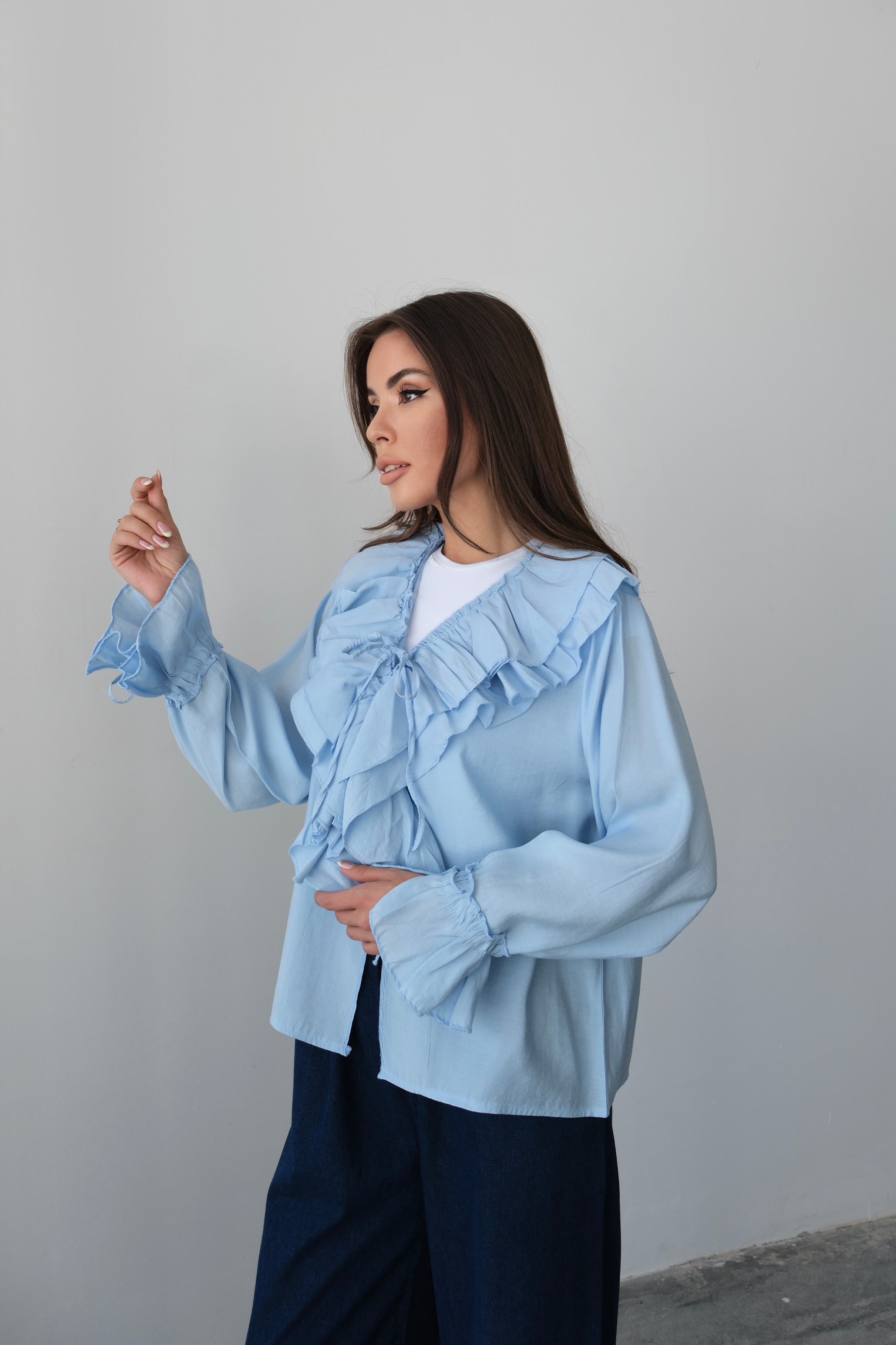 Hem günlük kullanımda zarafetinizi ön plana çıkarmak hem de özel günlerde romantik bir hava yaratmak için ideal bir seçenek olan bu fırfırlı uzun kollu bluz, jeanler, etekler ve pantolonlarla kolayca kombinlenebilir. Şık bir etek ve topuklu ayakkabılarla tamamlayarak göz alıcı bir görünüm elde edebilirsiniz.