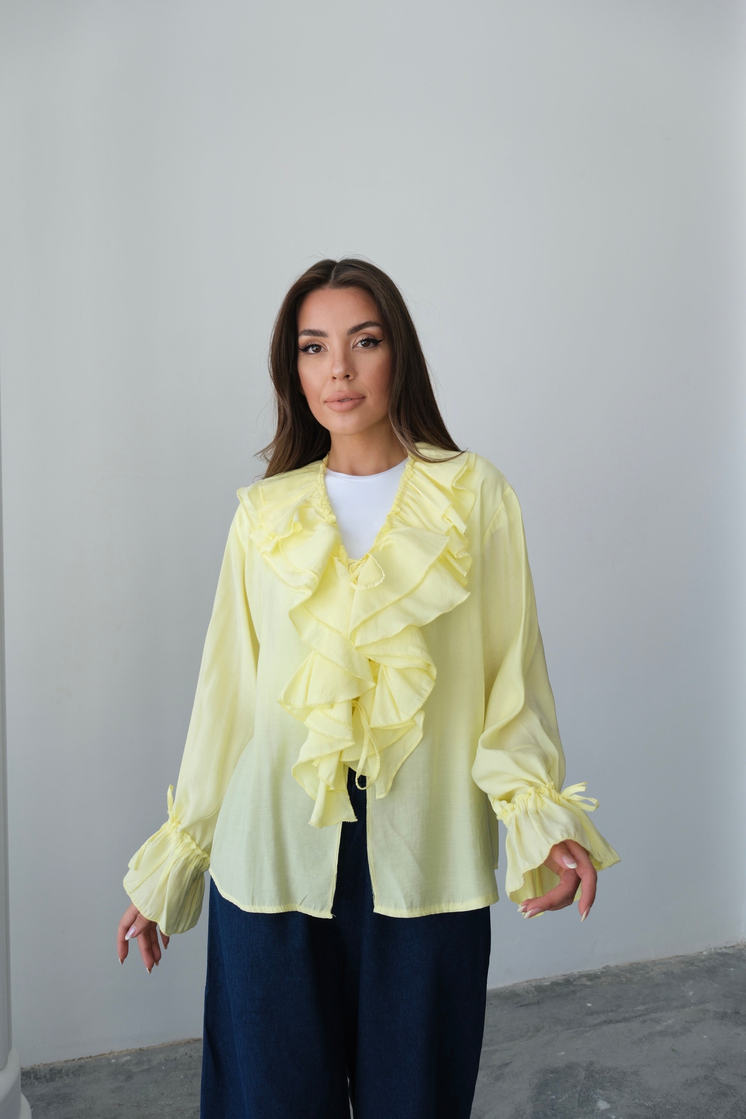 Fırfırlı Bağlama Detaylı Uzun Kollu Bluz 8834 - Sarı
