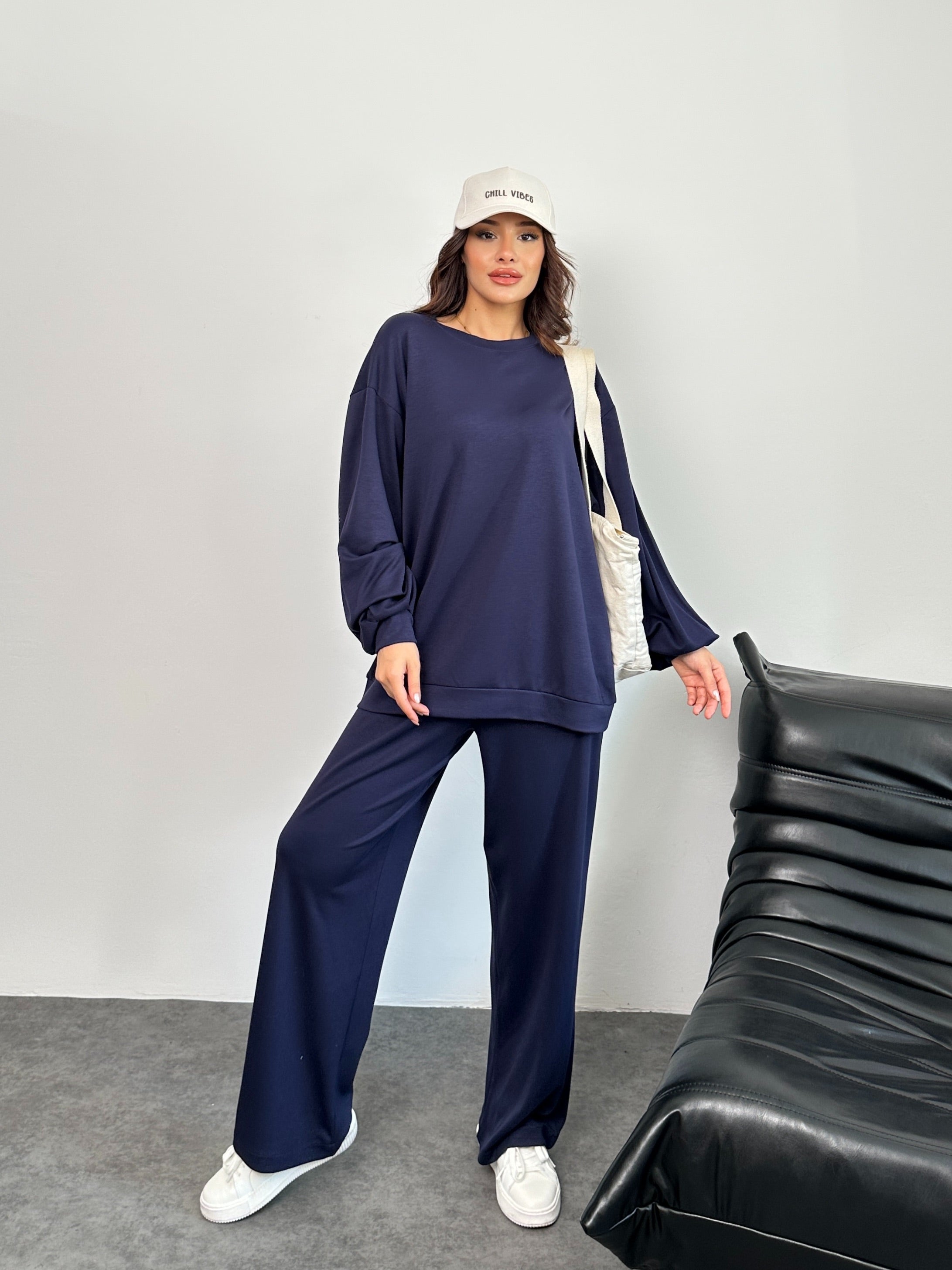 Takımın alt parçası olan bol paça pantolon, geniş ve dökümlü kesimiyle rahat bir kullanım sunar. Pantolonun ve sweatshirt'ün uyumlu lacivert tonu, takıma monokrom ve şık bir görünüm katmaktadır.