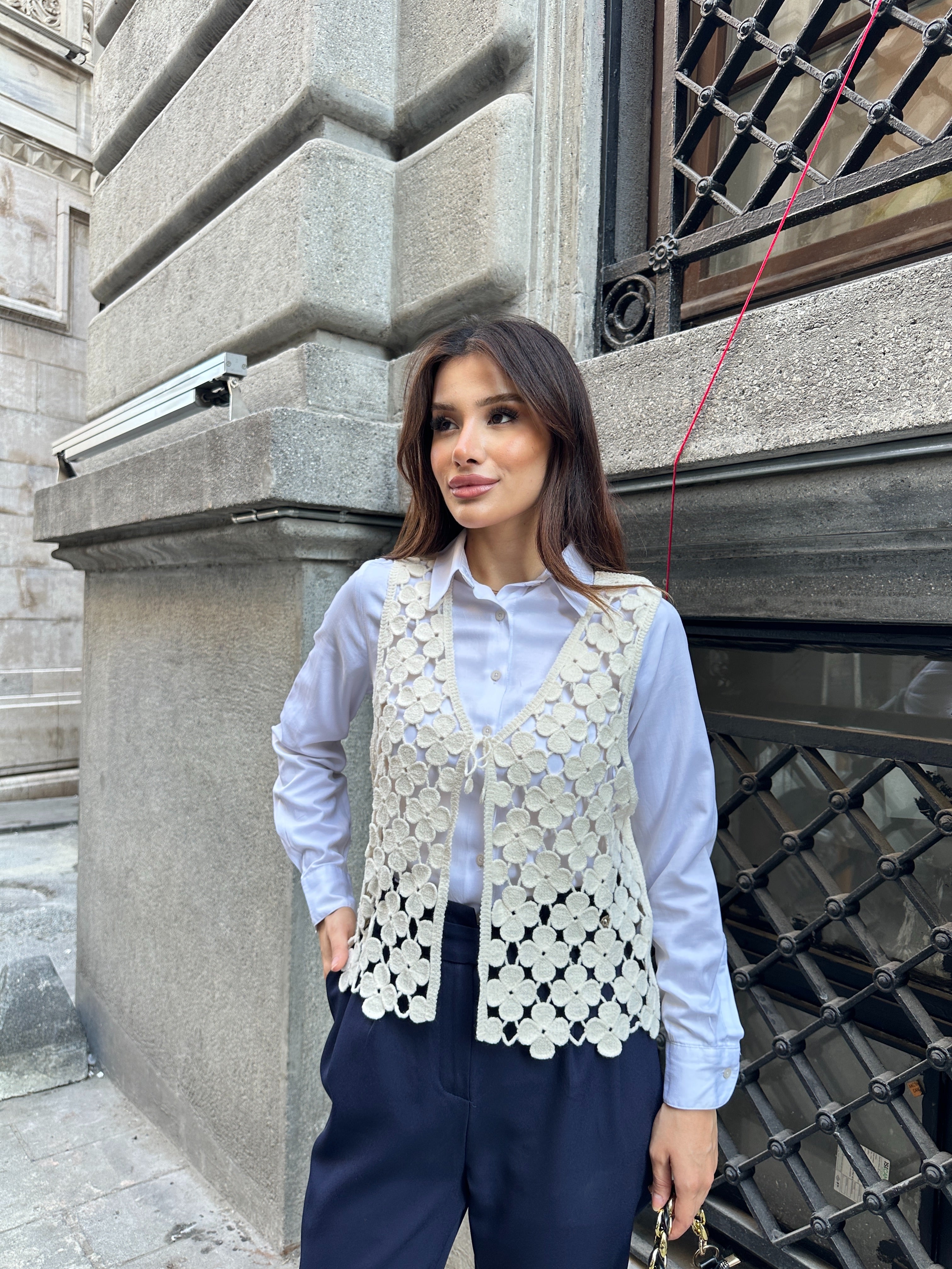 HatunAtila Çiçek Desenli Akrilik Süzene Yelek 5196 - Ekru