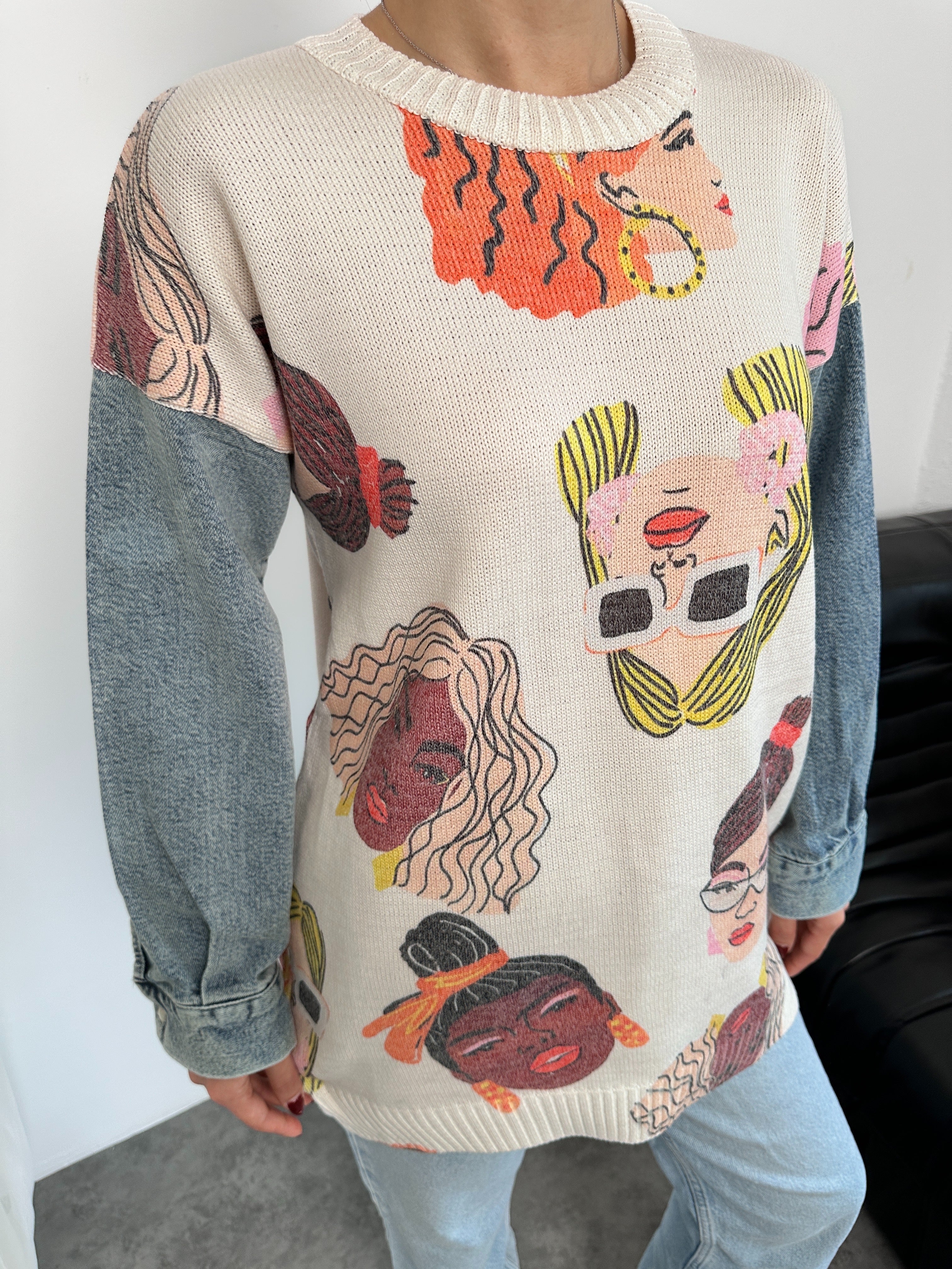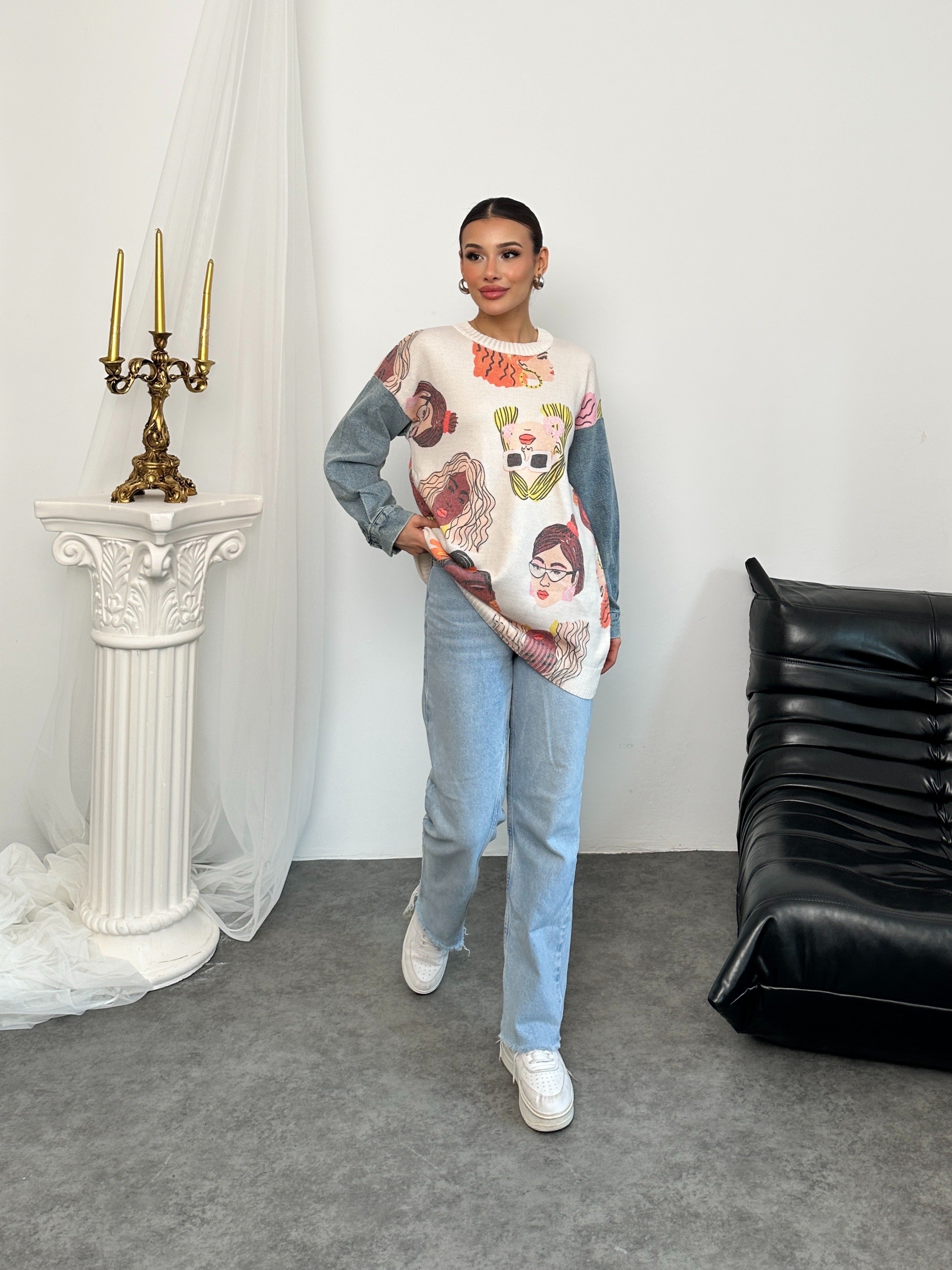 HatunAtila Desenli Bisiklet Yaka Kot Kollu Uzun Kazak - 4770-4