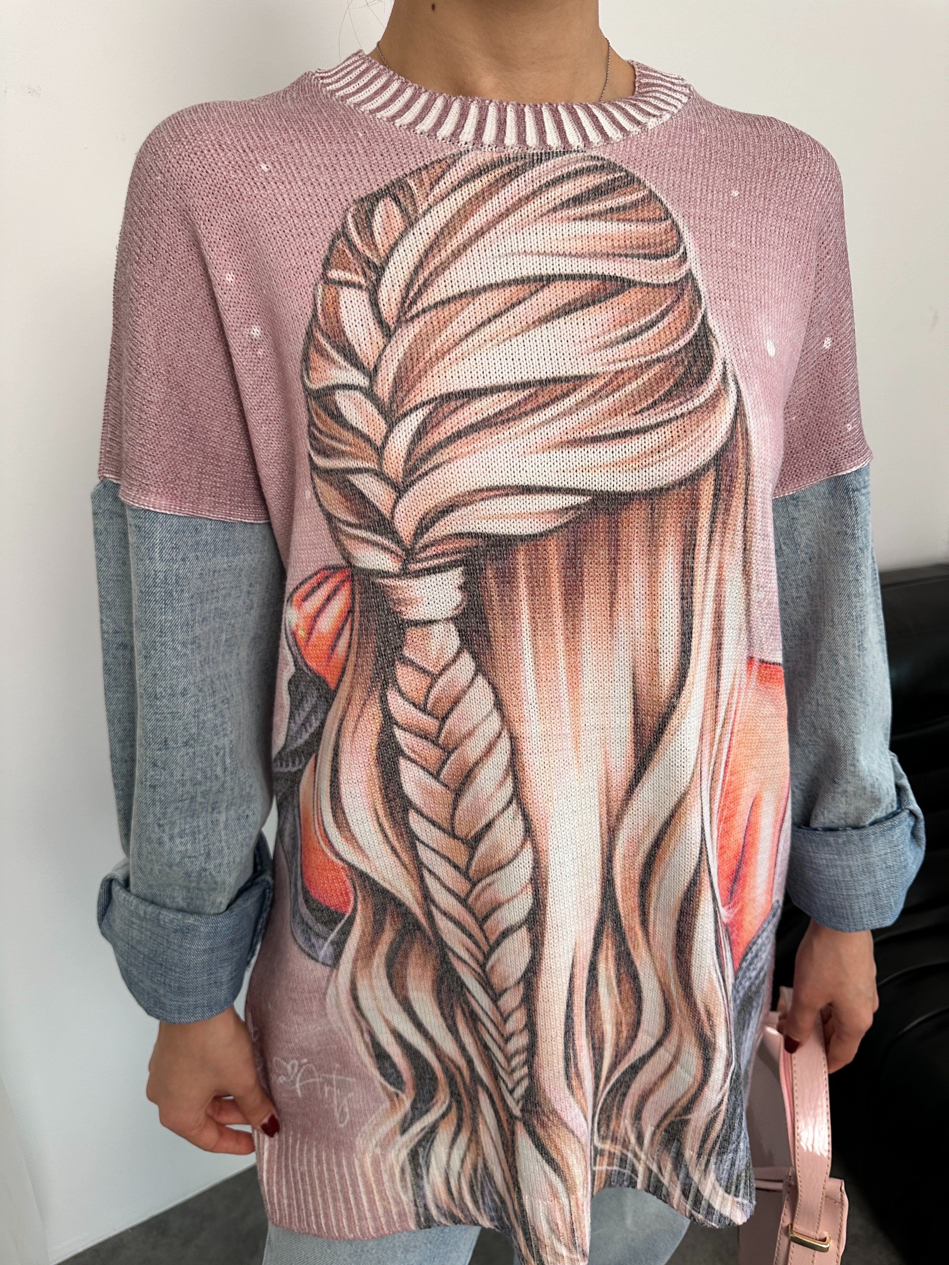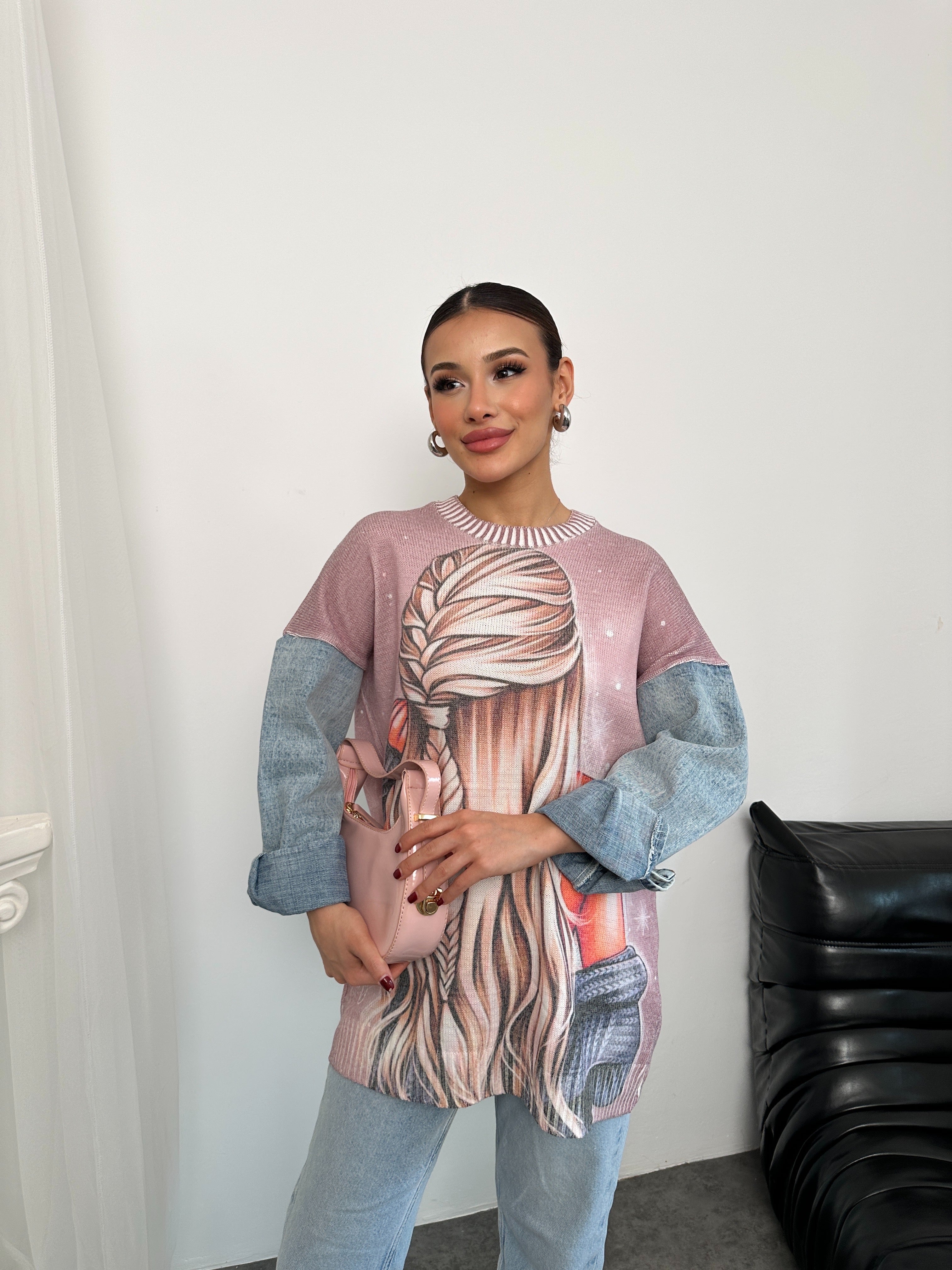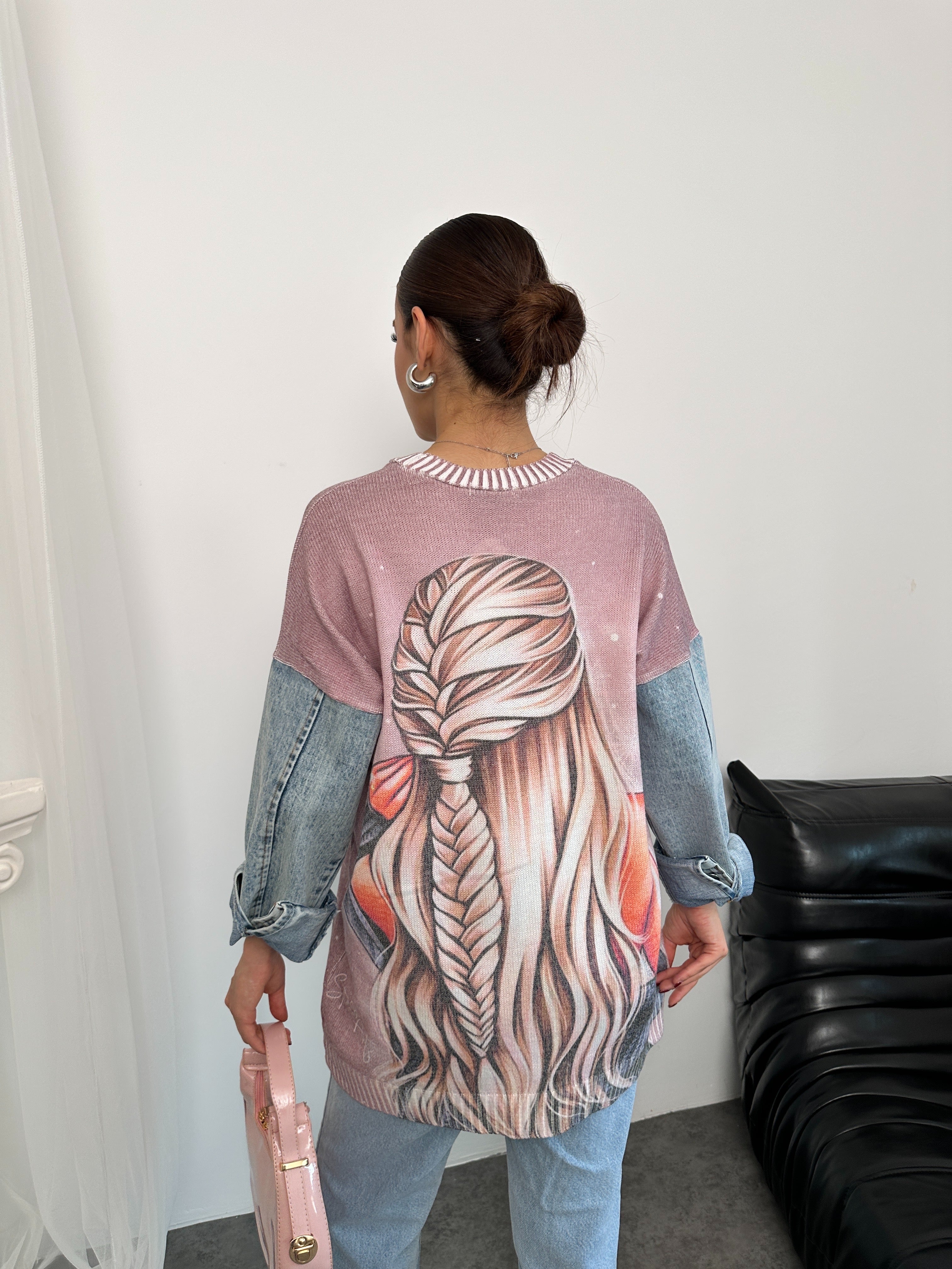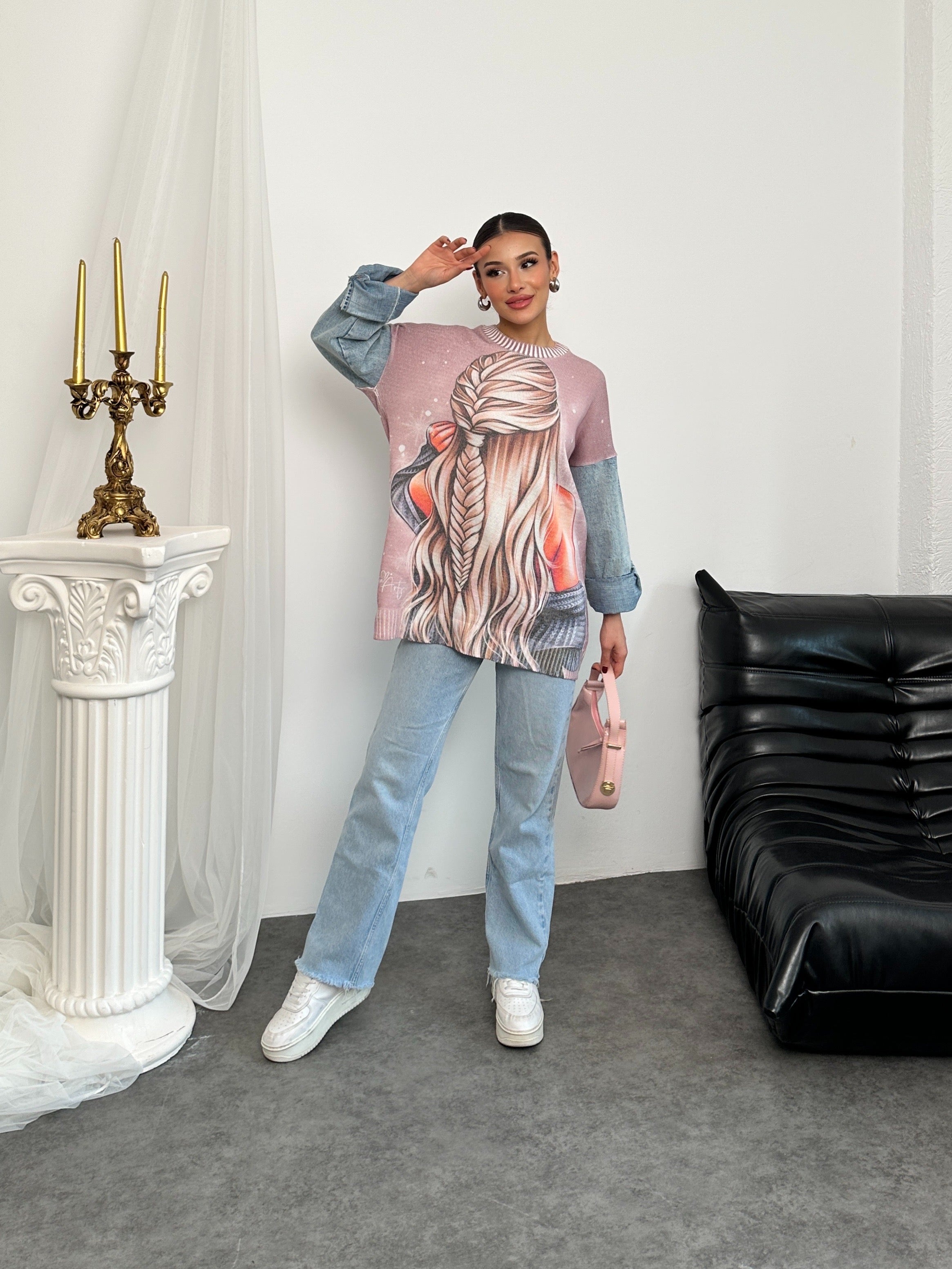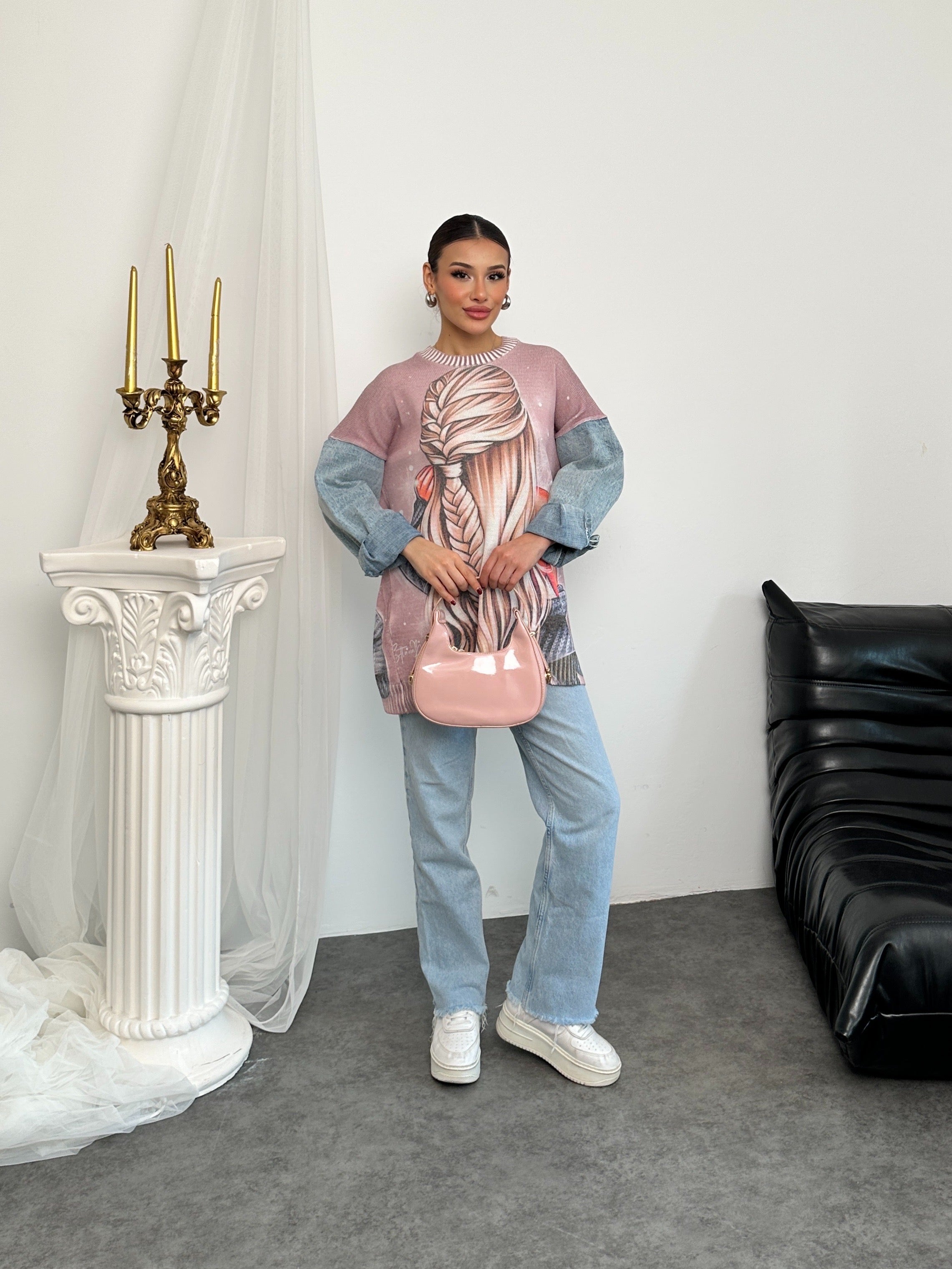 HatunAtila Desenli Bisiklet Yaka Kot Kollu Uzun Kazak - 4770-5