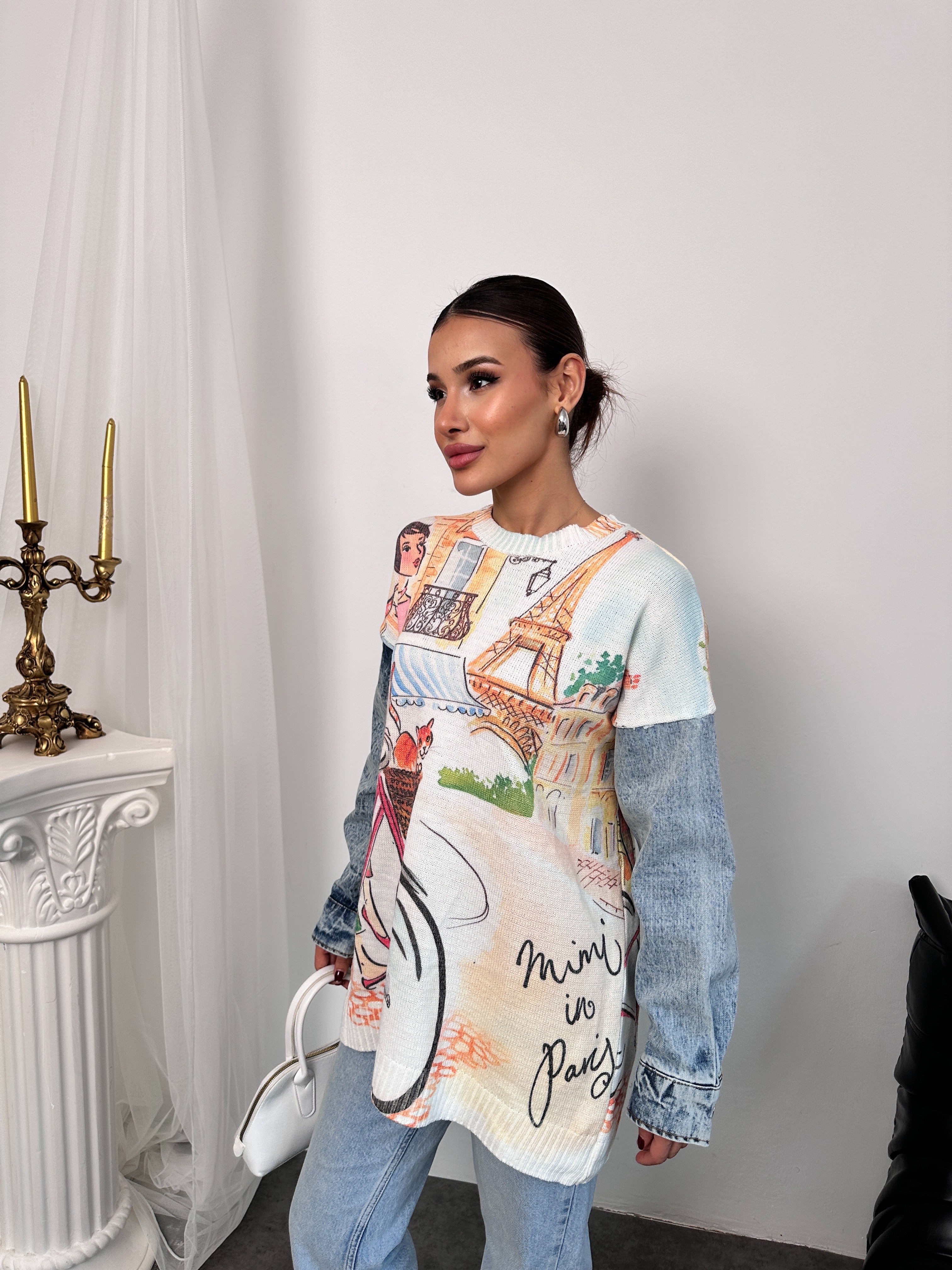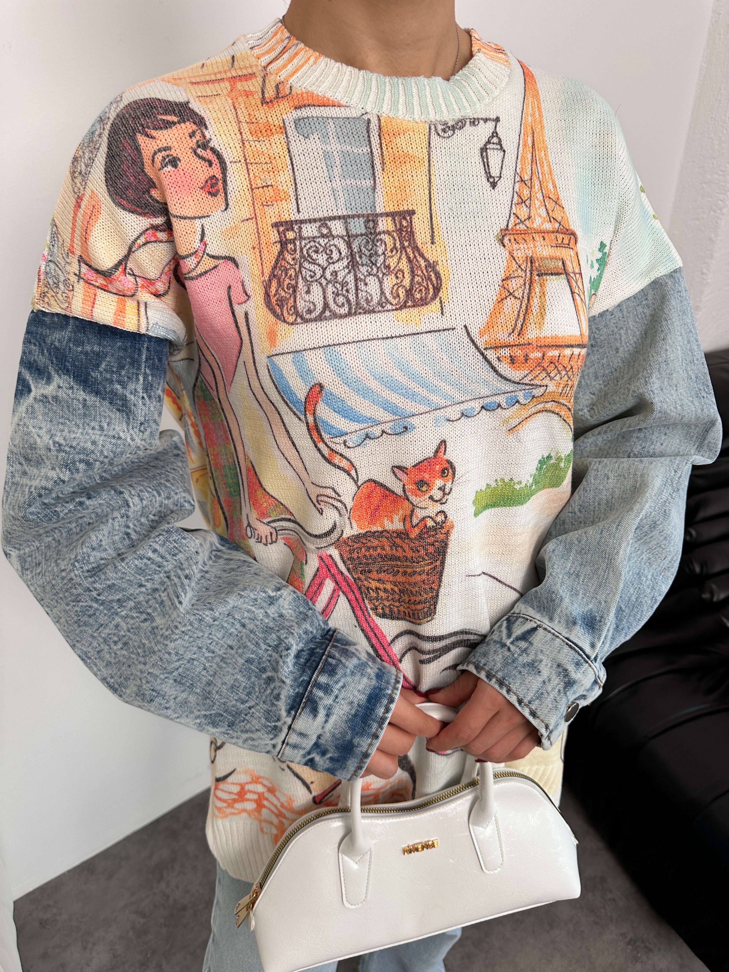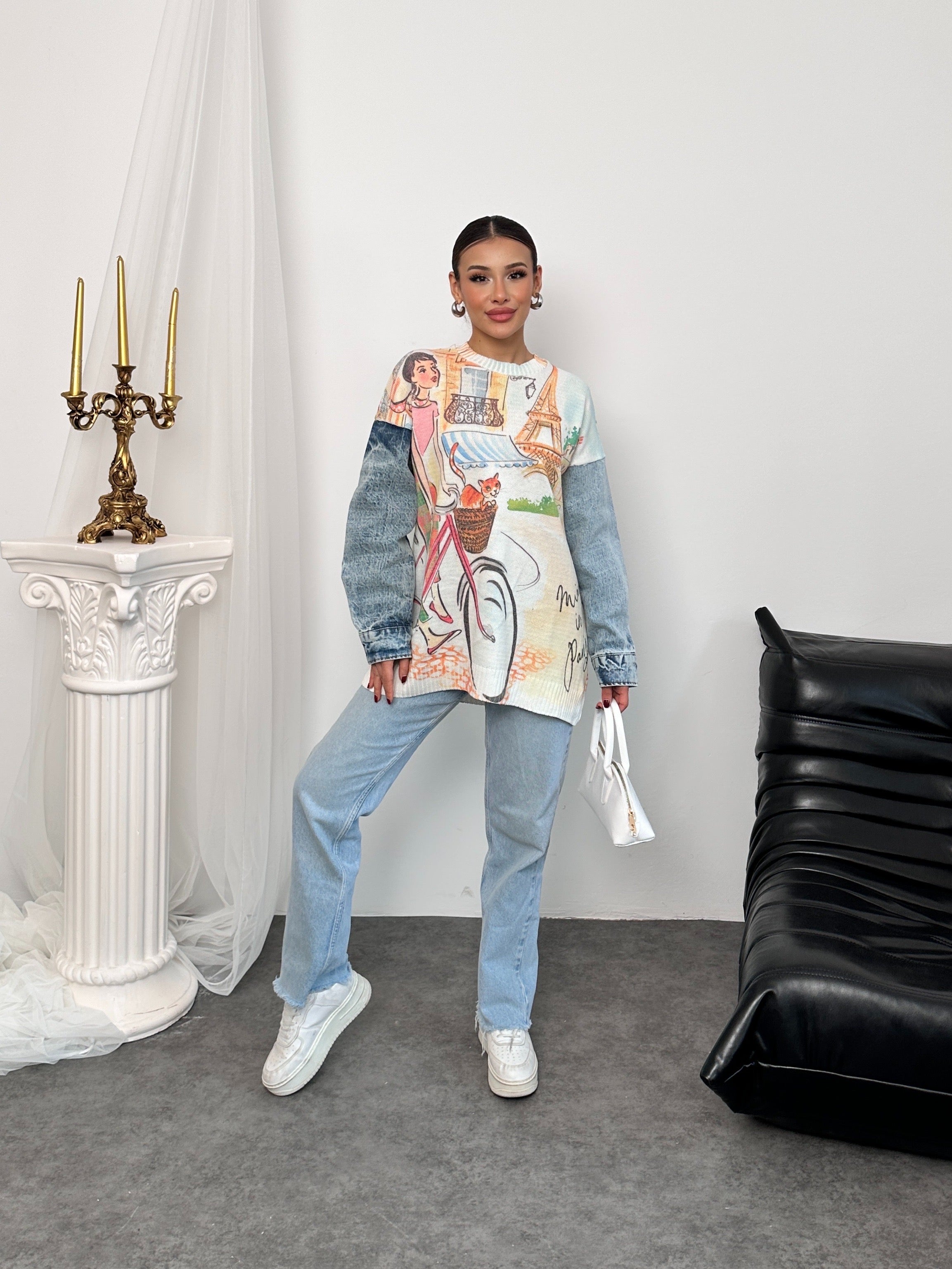 HatunAtila Desenli Bisiklet Yaka Kot Kollu Uzun Kazak - 4770-11