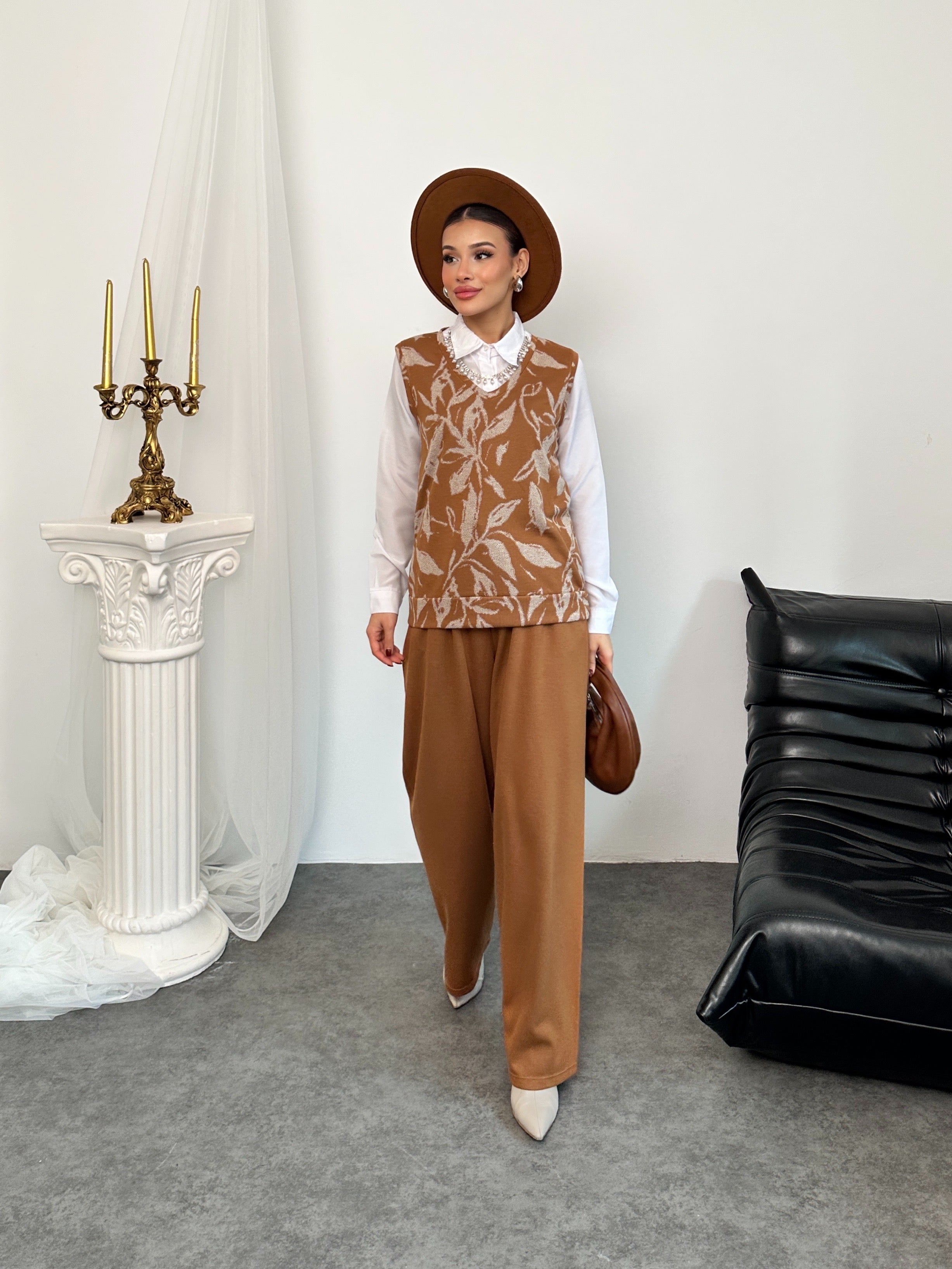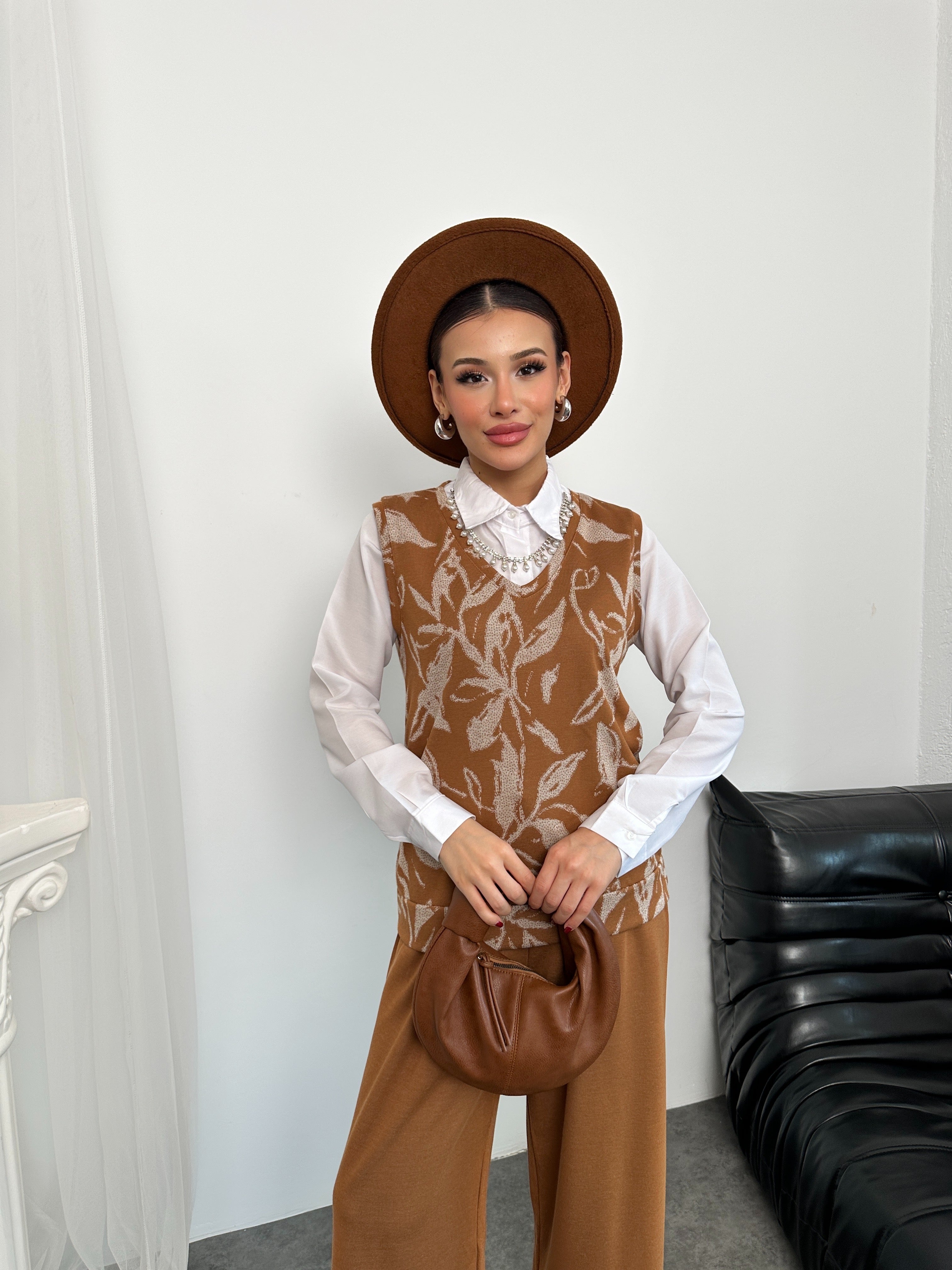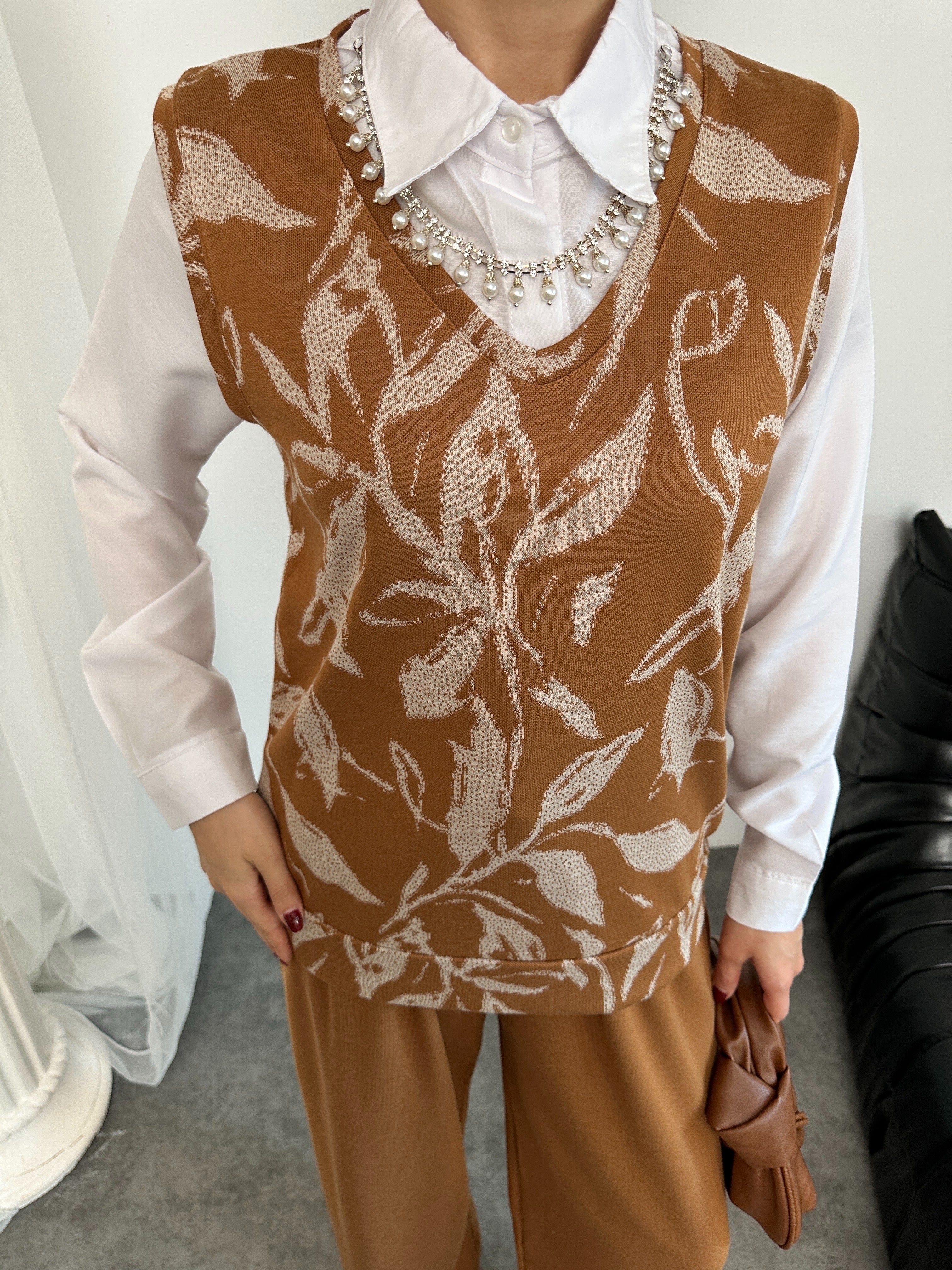 🌿 İnci Kolye Detaylı Süveter, Beyaz Gömlek ve Geniş Paça Pantolon Üçlü Takım - Kahve