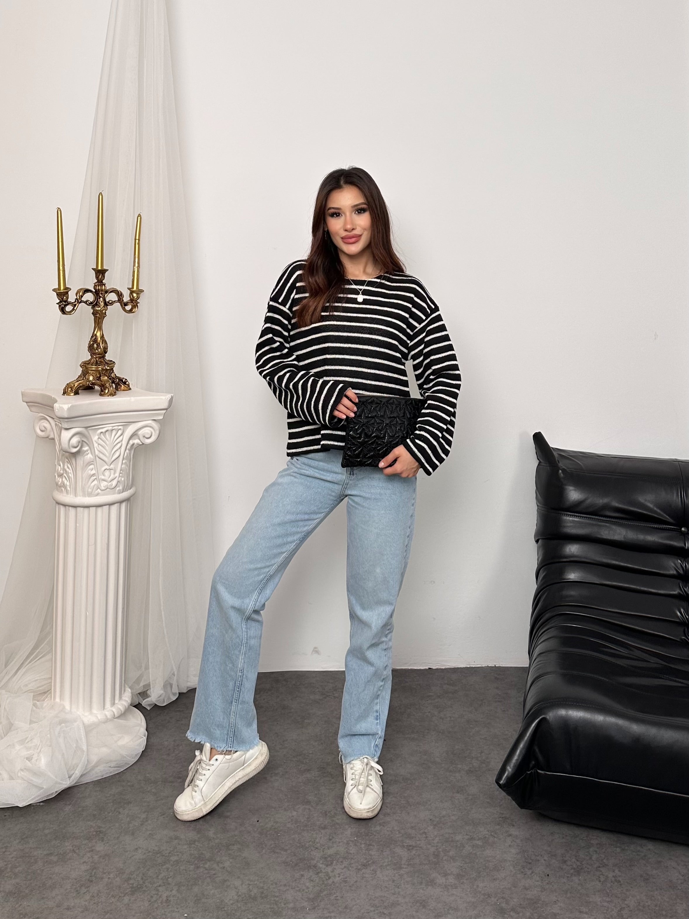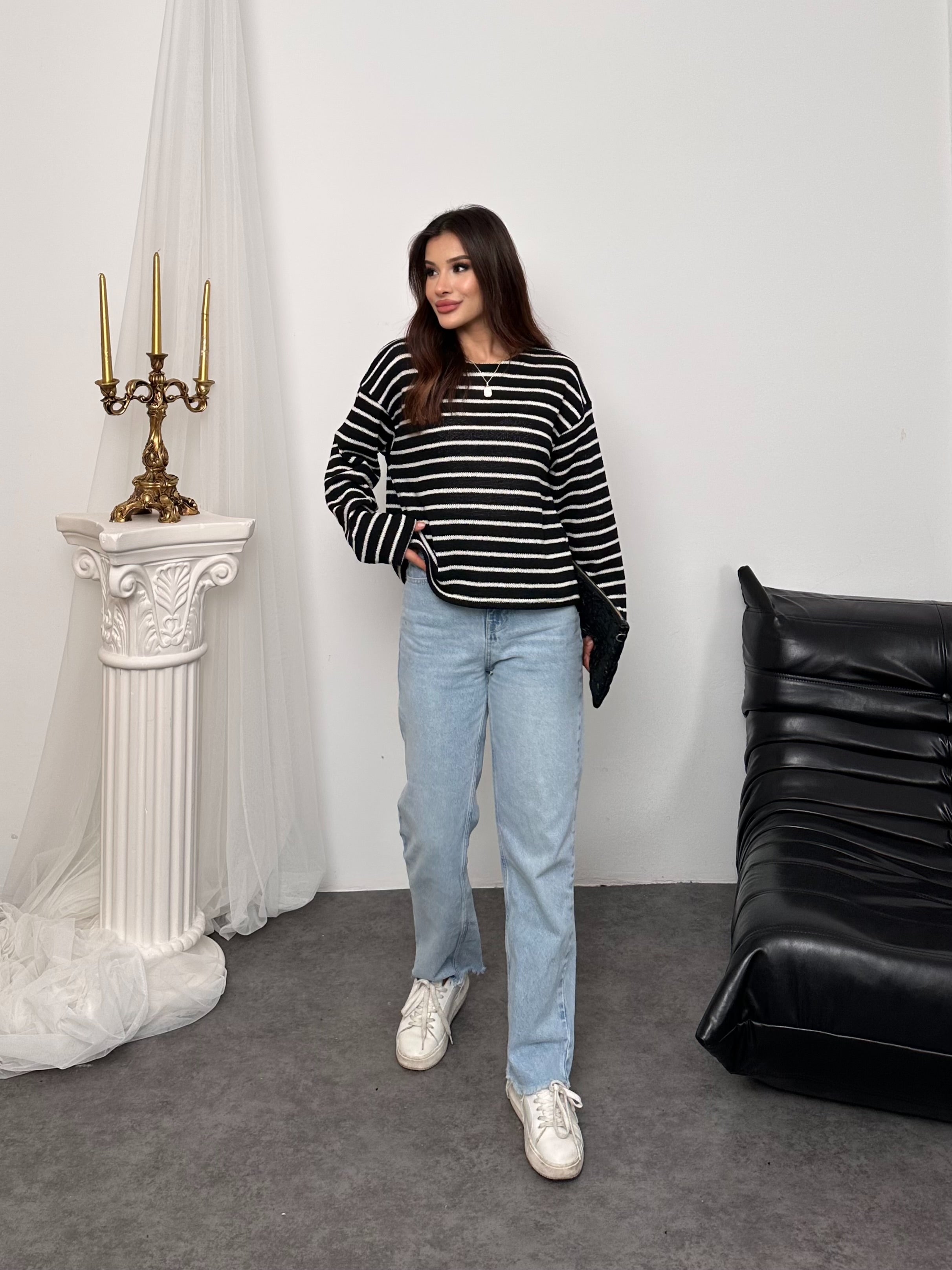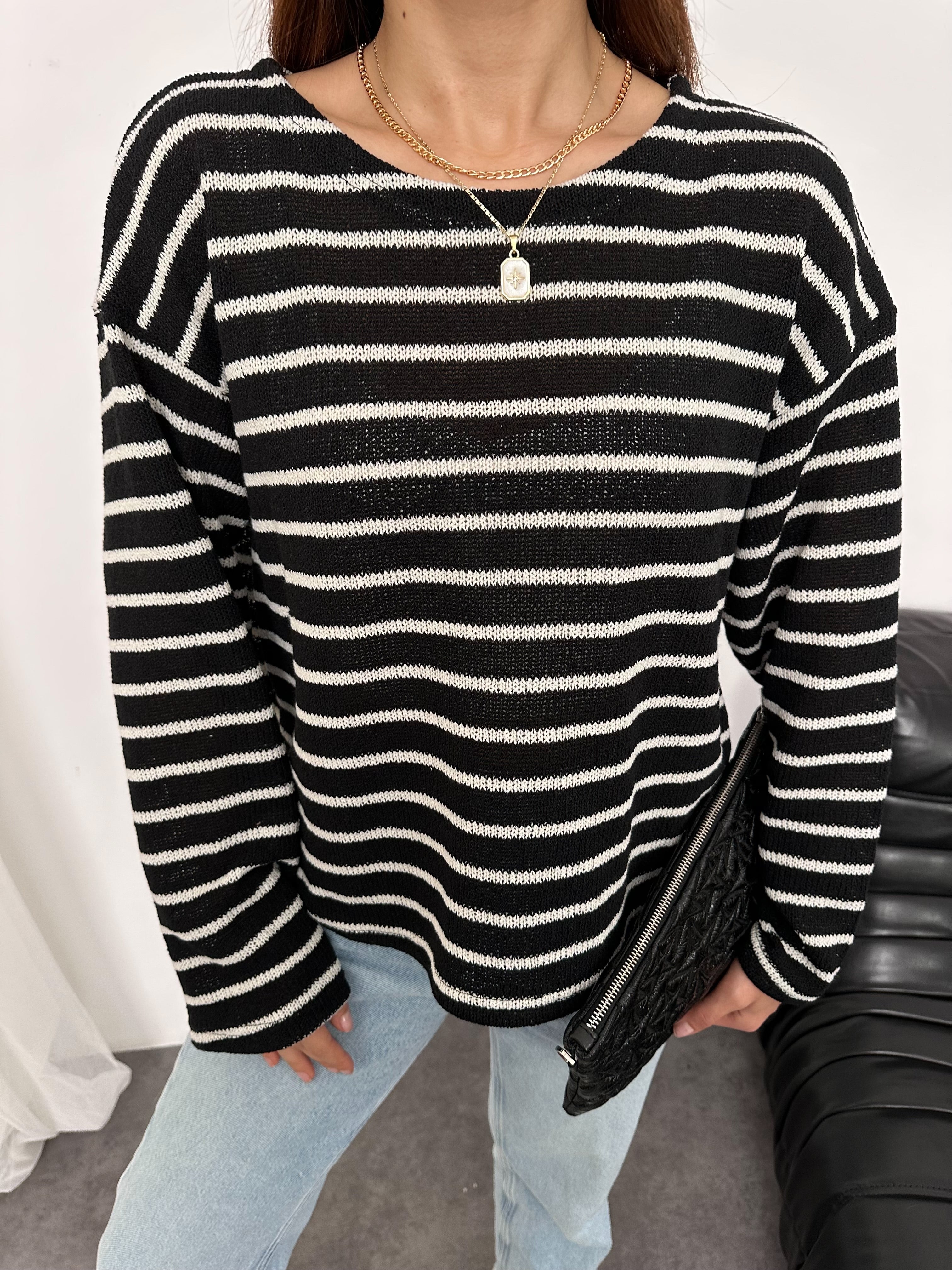 Kadın Bisiklet Yaka Çizgili Oversize Triko Kazak 8955 - Siyah
