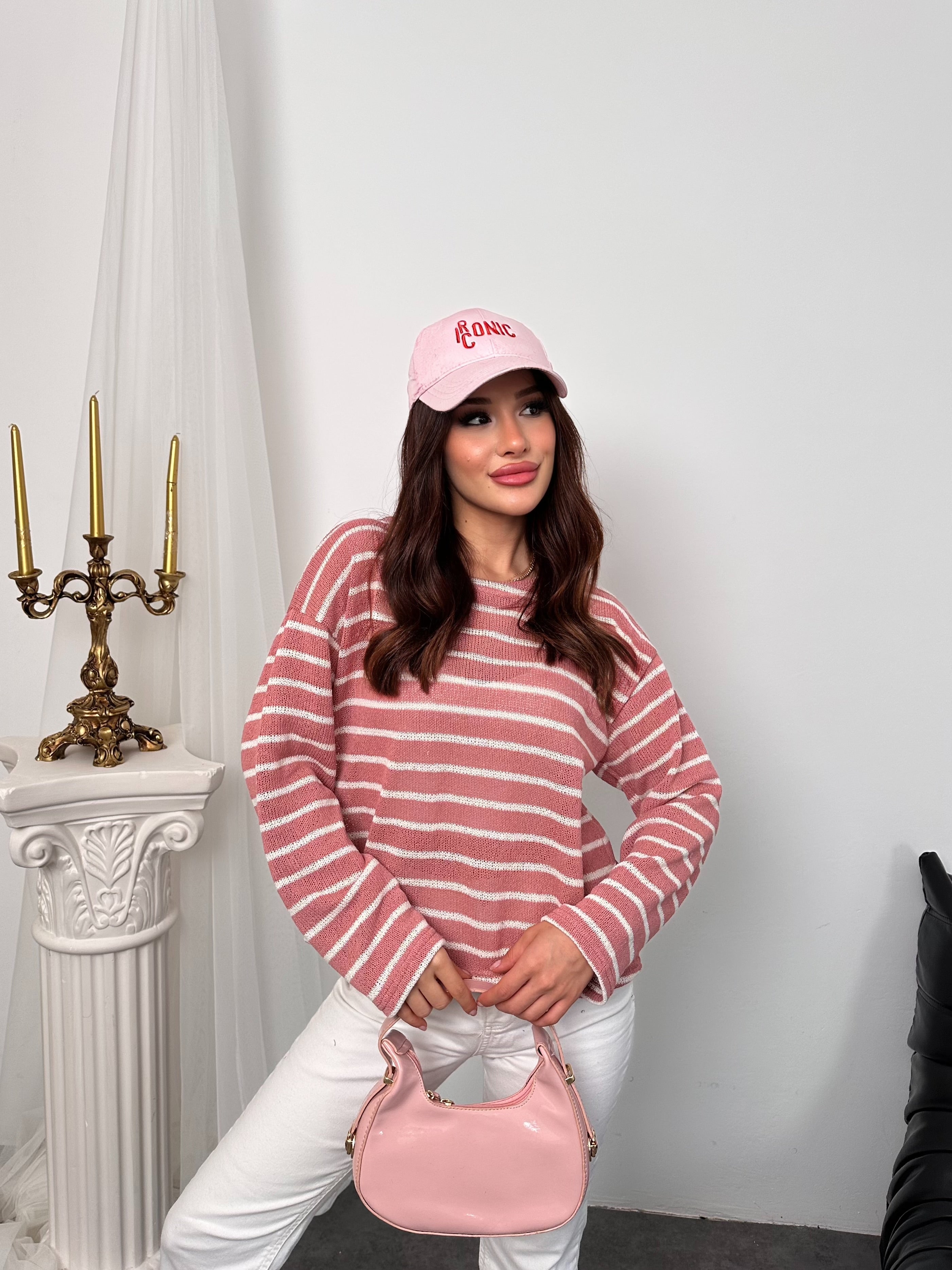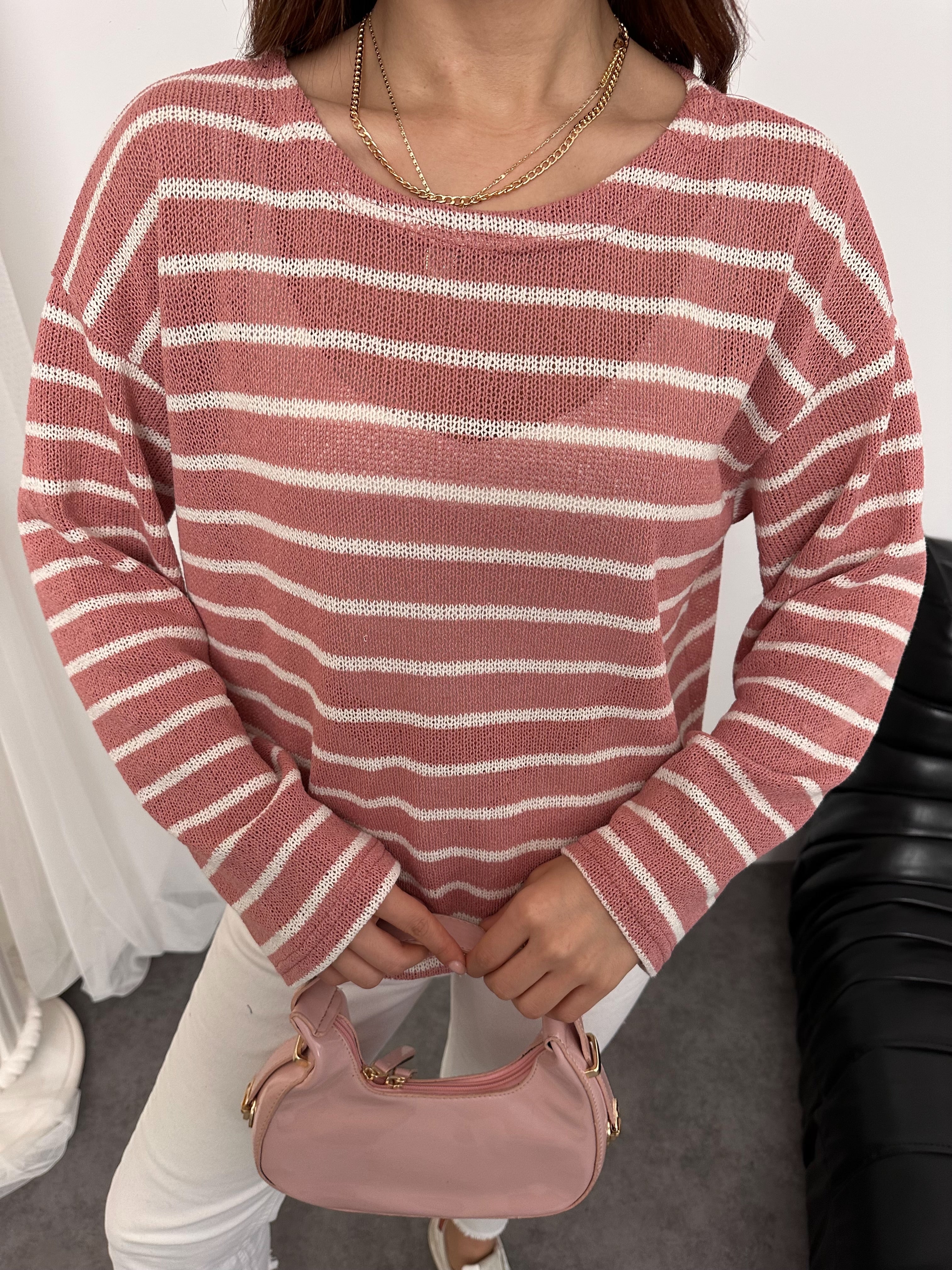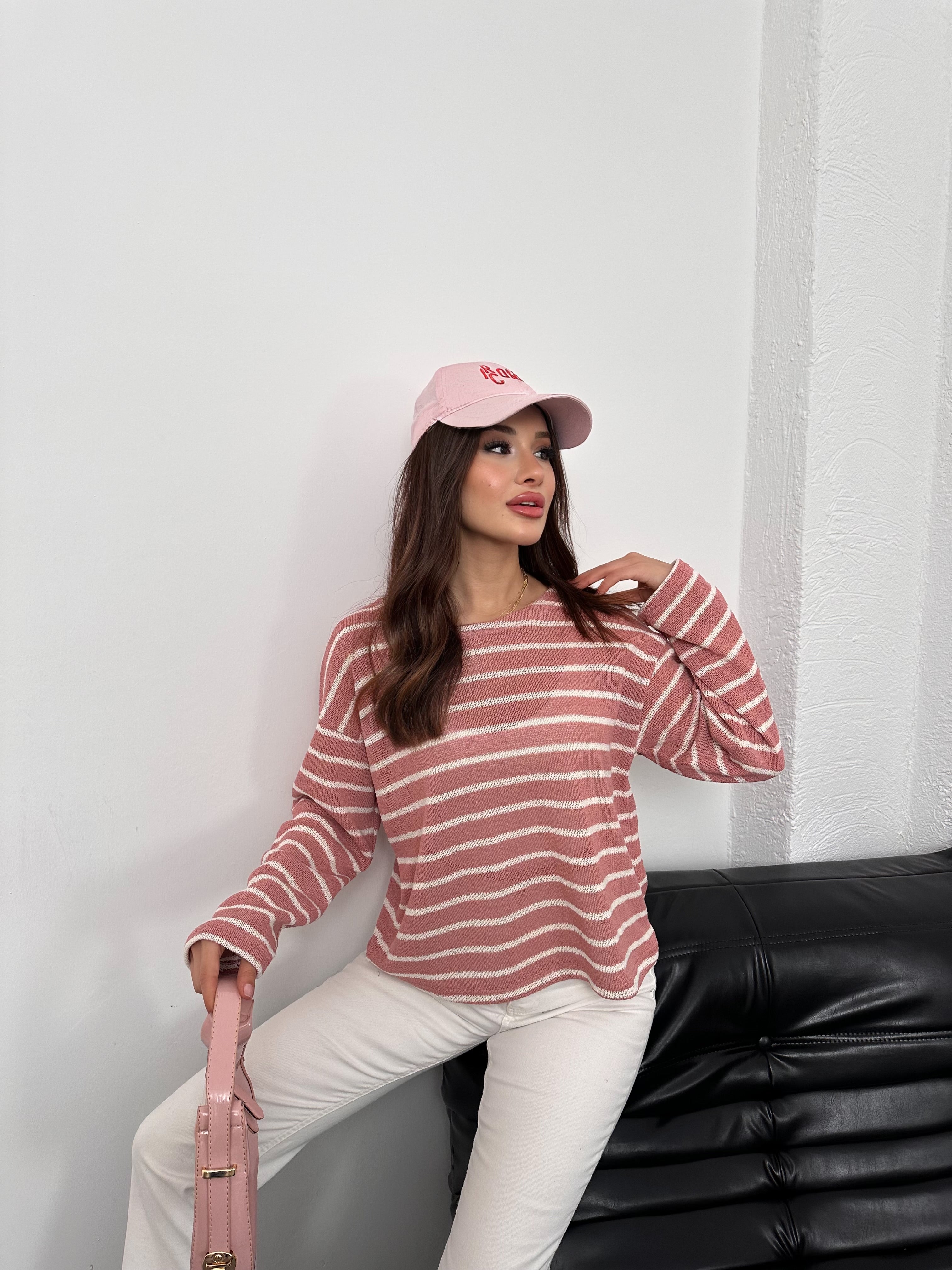 Kadın Bisiklet Yaka Çizgili Oversize Triko Kazak 8955 - Pembe