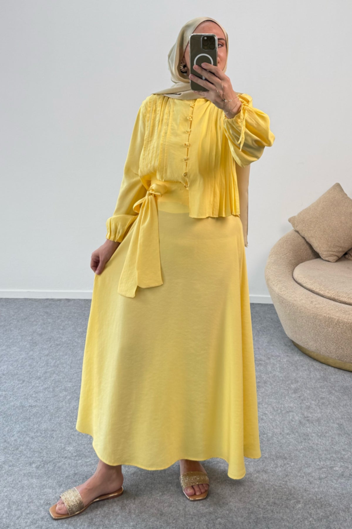 Kolları Büzgülü Nervürlü Kuşaklı Gömlek ve Uzun Etekli İkili Takım 8875 - Sarı