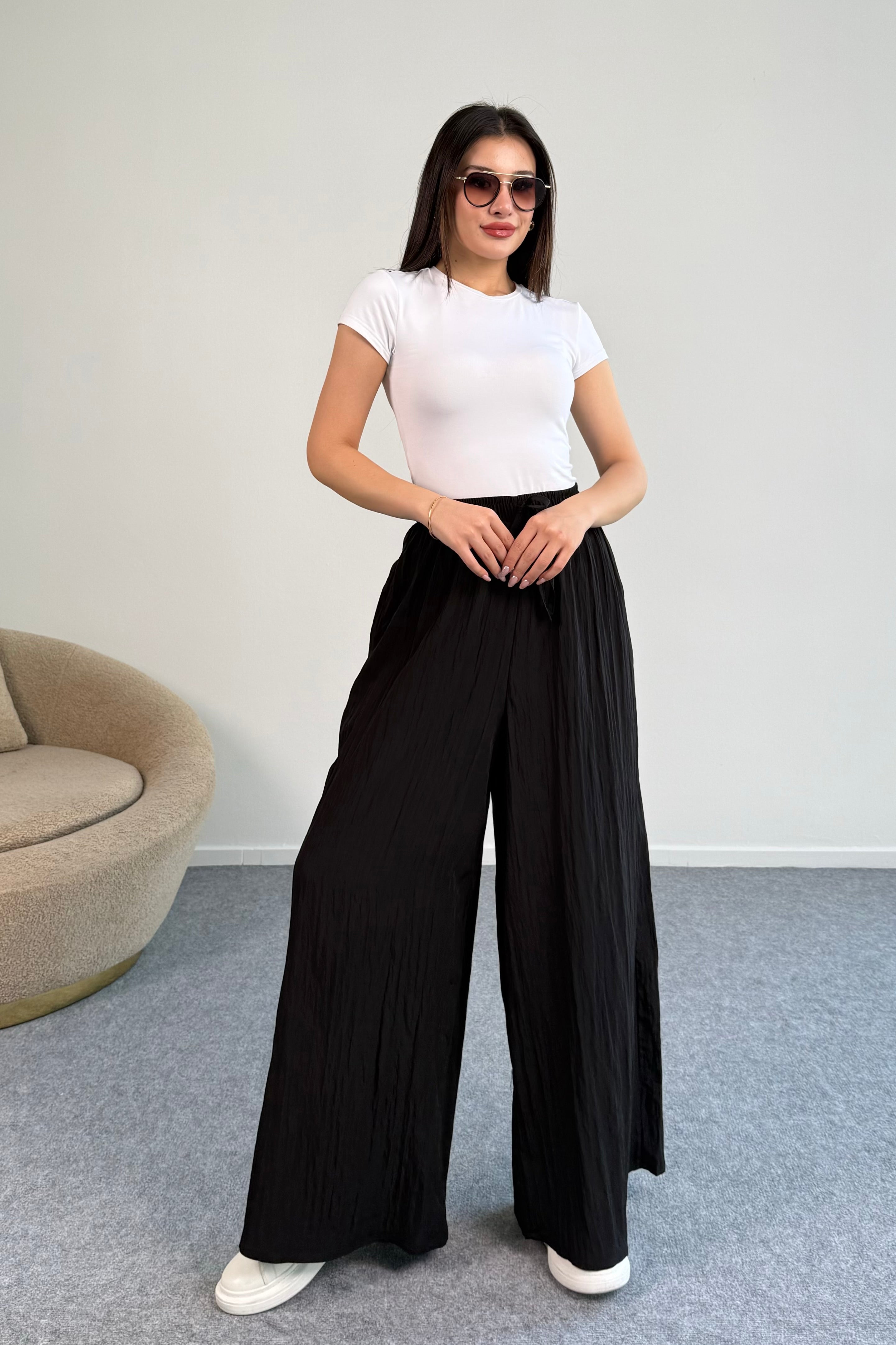 Kraşlı Beli Lastikli Modal Geniş Paça Palazzo Pantolon 8846 - Siyah
