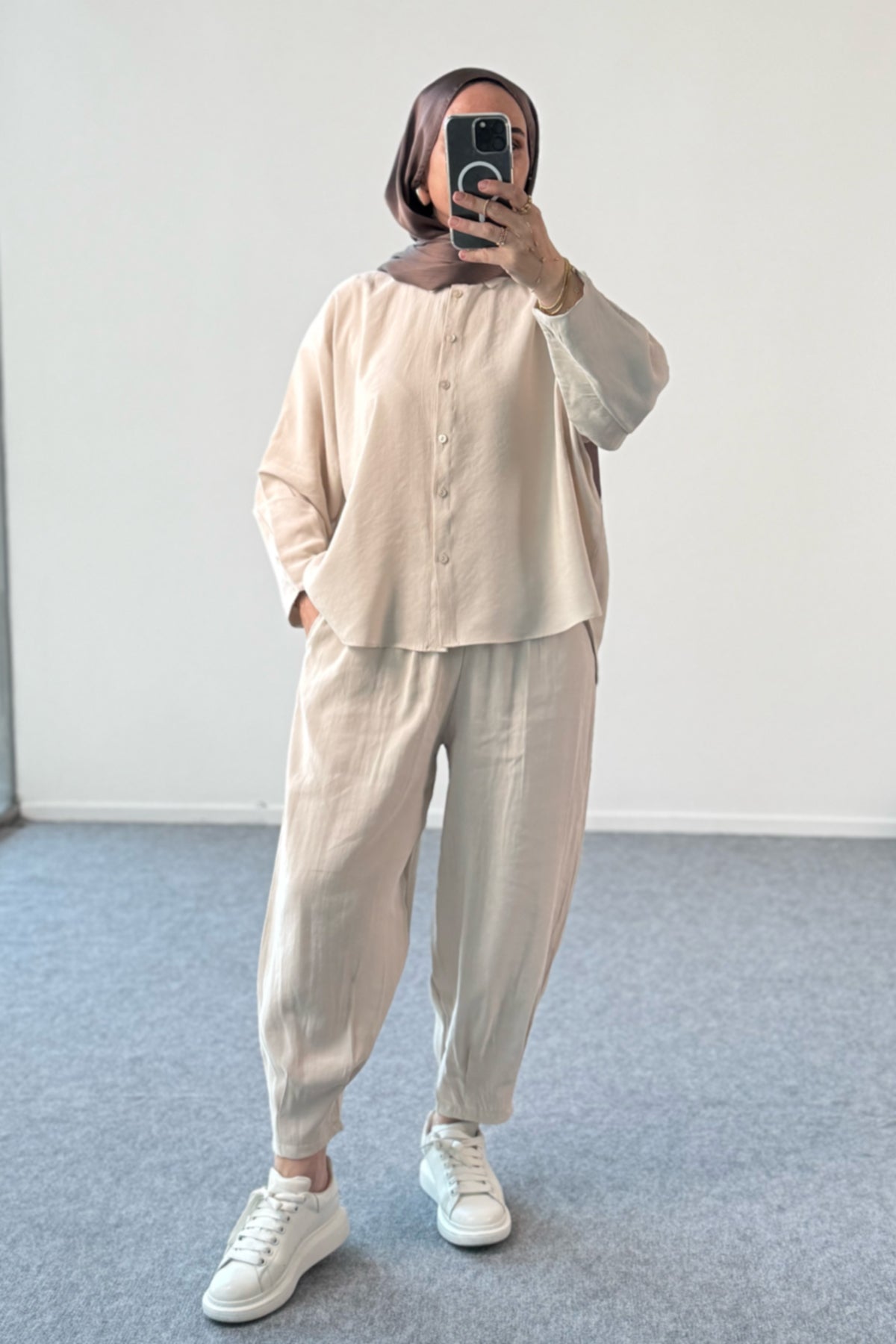 Modal Kumaş Oversize Gömlekli Şalvar Pantolonlu İkili Takım 5210 - Bej