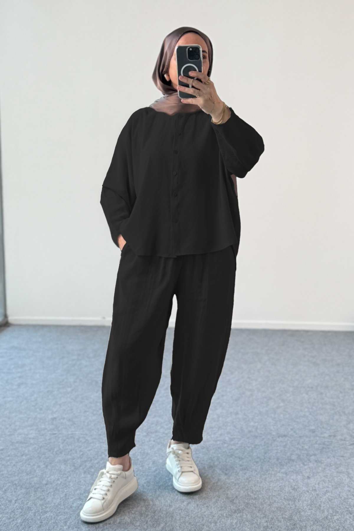 Modal Kumaş Oversize Gömlekli Şalvar Pantolonlu İkili Takım 5210 - Siyah