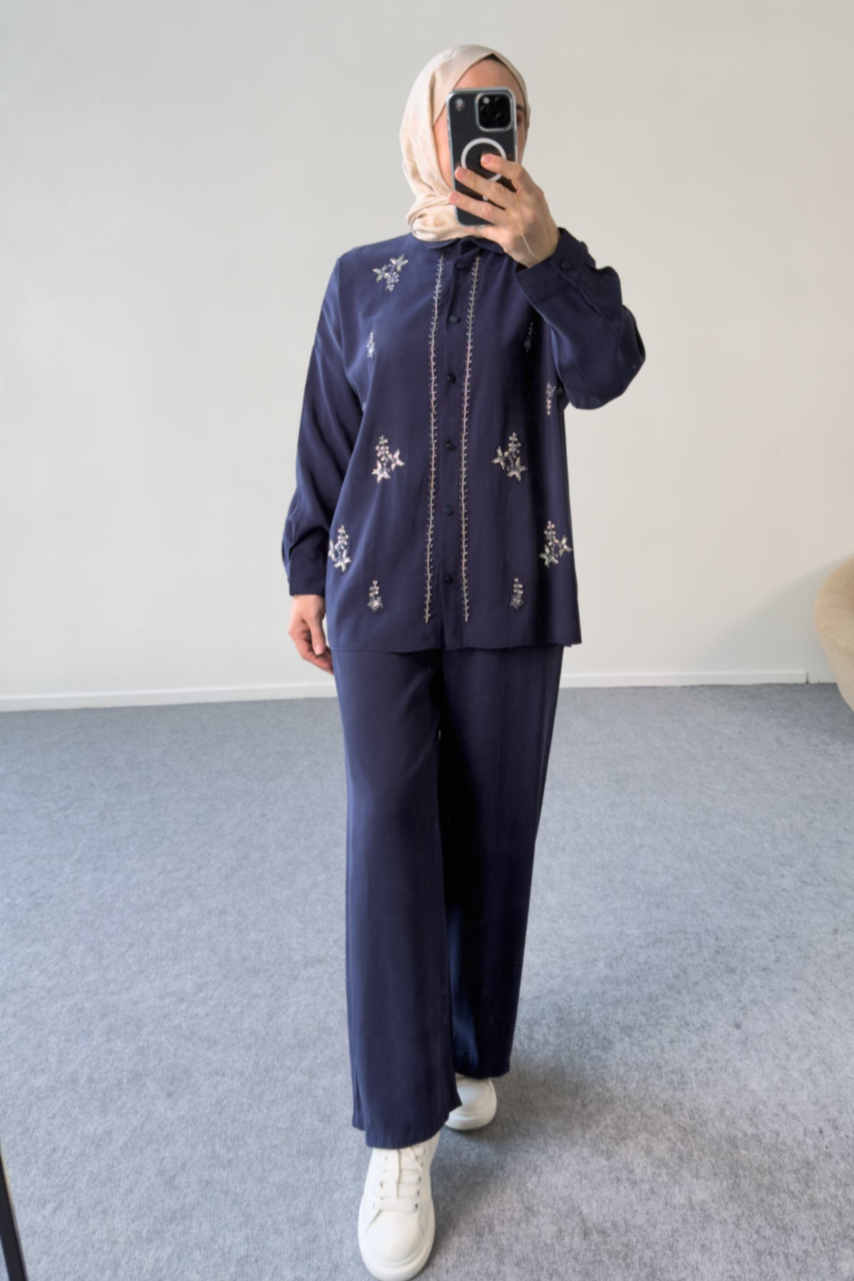 Rahat kesimli, uzun kollu gömlek ve beli lastikli, dökümlü geniş paça pantolon ile hem konforlu hem de şık bir siluet oluşturur. Gömleğin ön kısmındaki düğme detayları ve manşetlerindeki zarif kıvrımlar tasarıma ayrı bir zarafet katmaktadır. Hafif ve hoş dokulu kumaşı sayesinde gün boyu rahat bir kullanım sunar.