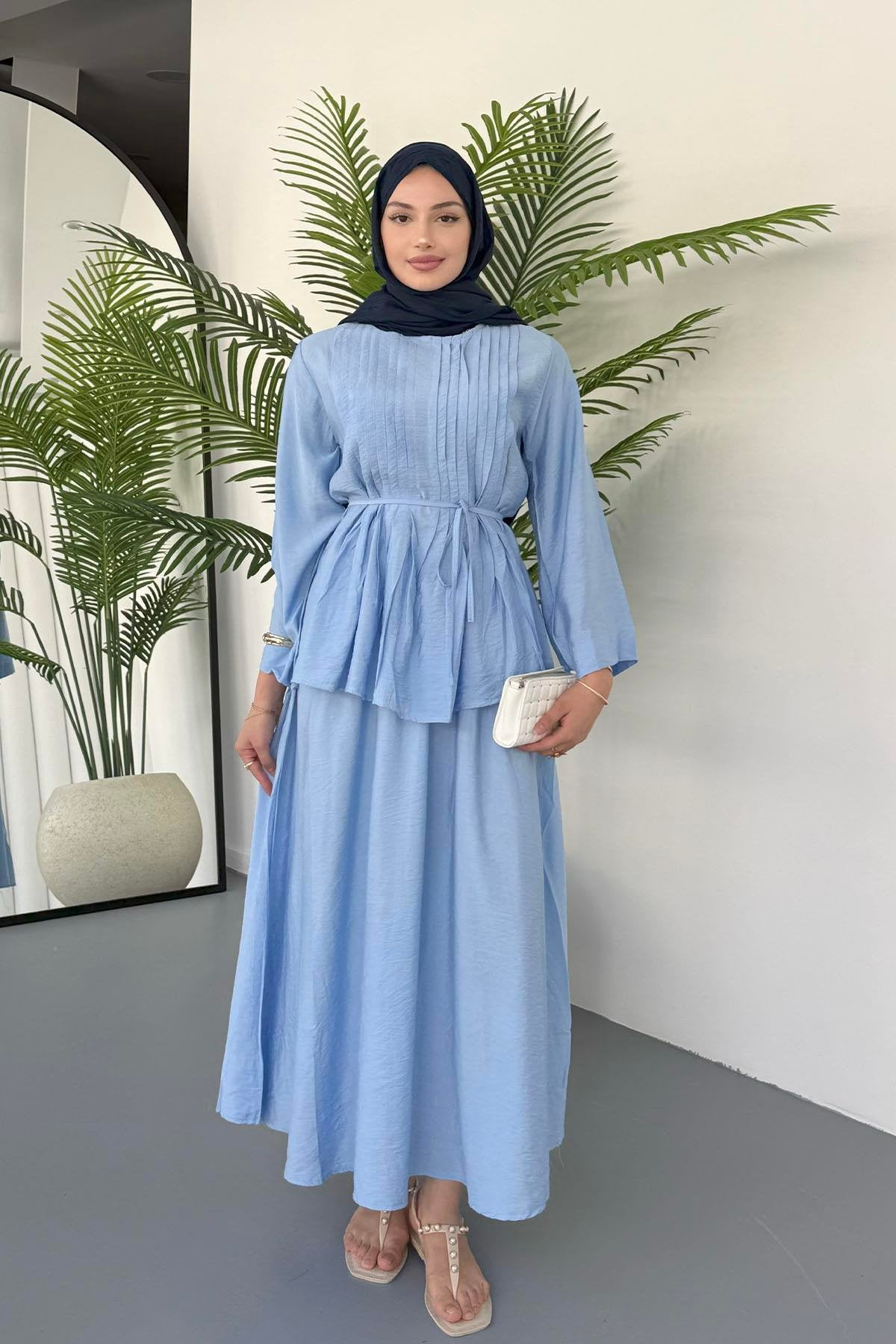 Zarafeti ve özgün detayları bir araya getirin, özel günlerinizde dikkat çekin. Açık mavi rengi ve kumaşın üzerindeki ince, dikey nervür (plise) detaylarıyla öne çıkan bu takım, modern ve şık bir görünüm sunar.