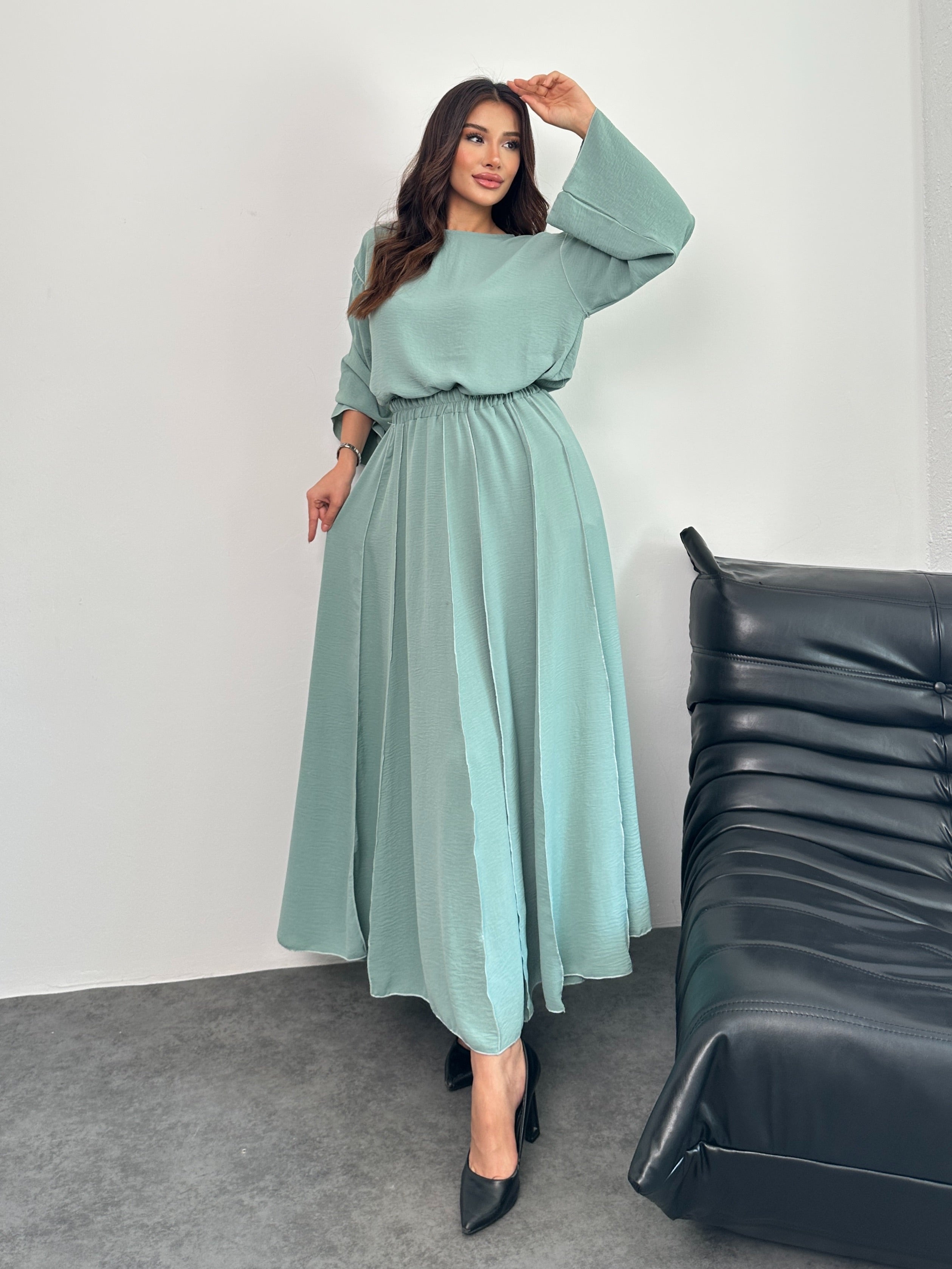 Alt parçası olan uzun etek, beli lastikli yapısı sayesinde hem konforlu hem de pratik bir giyim imkanı sunar. Etek üzerindeki beyaz dikişler, modele modern bir hava katarken, dökümlü kesimiyle zarif bir siluet oluşturur.