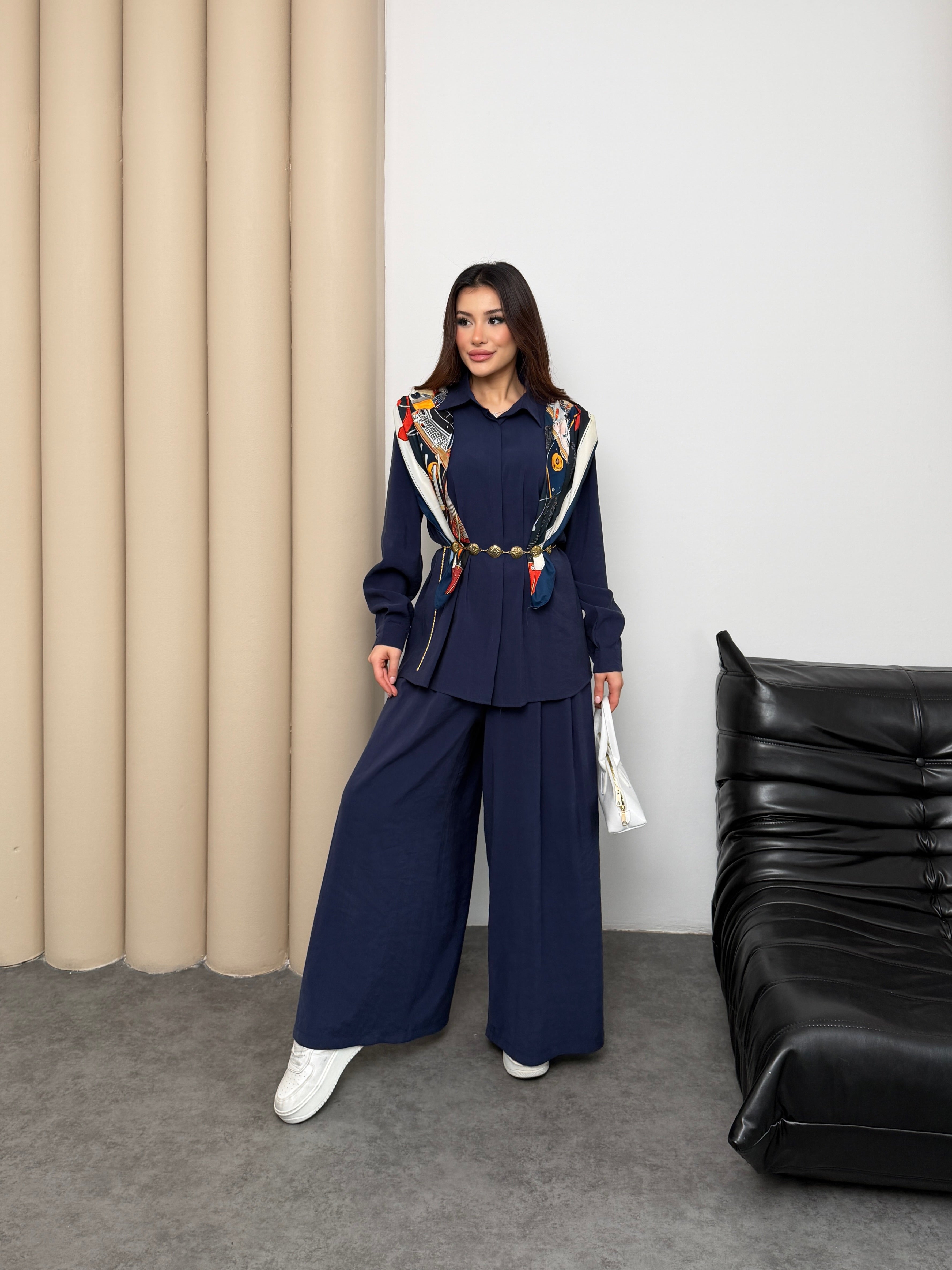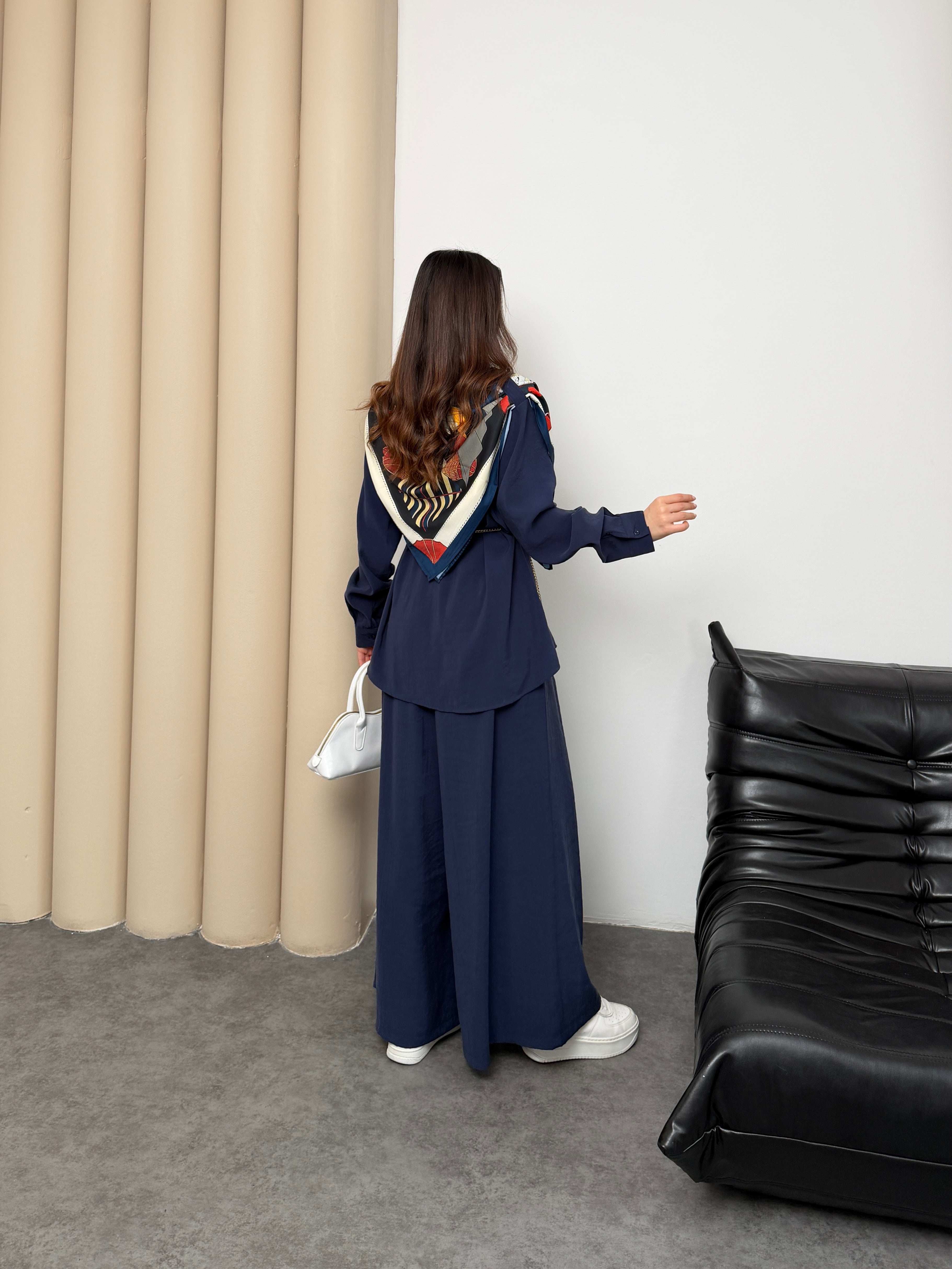Gardırobunuzun en joker parçası olmaya aday bu lacivert ikili takım, modern kesimi ve nefes alan dokusuyla hem ofis stilinize hem de günlük kombinlerinize eşlik ediyor. Klasik gömlek yaka detayı ve palazzo kesim geniş paça pantolonuyla, stilinizden ödün vermeden özgürce hareket etmenin tadını çıkarın.