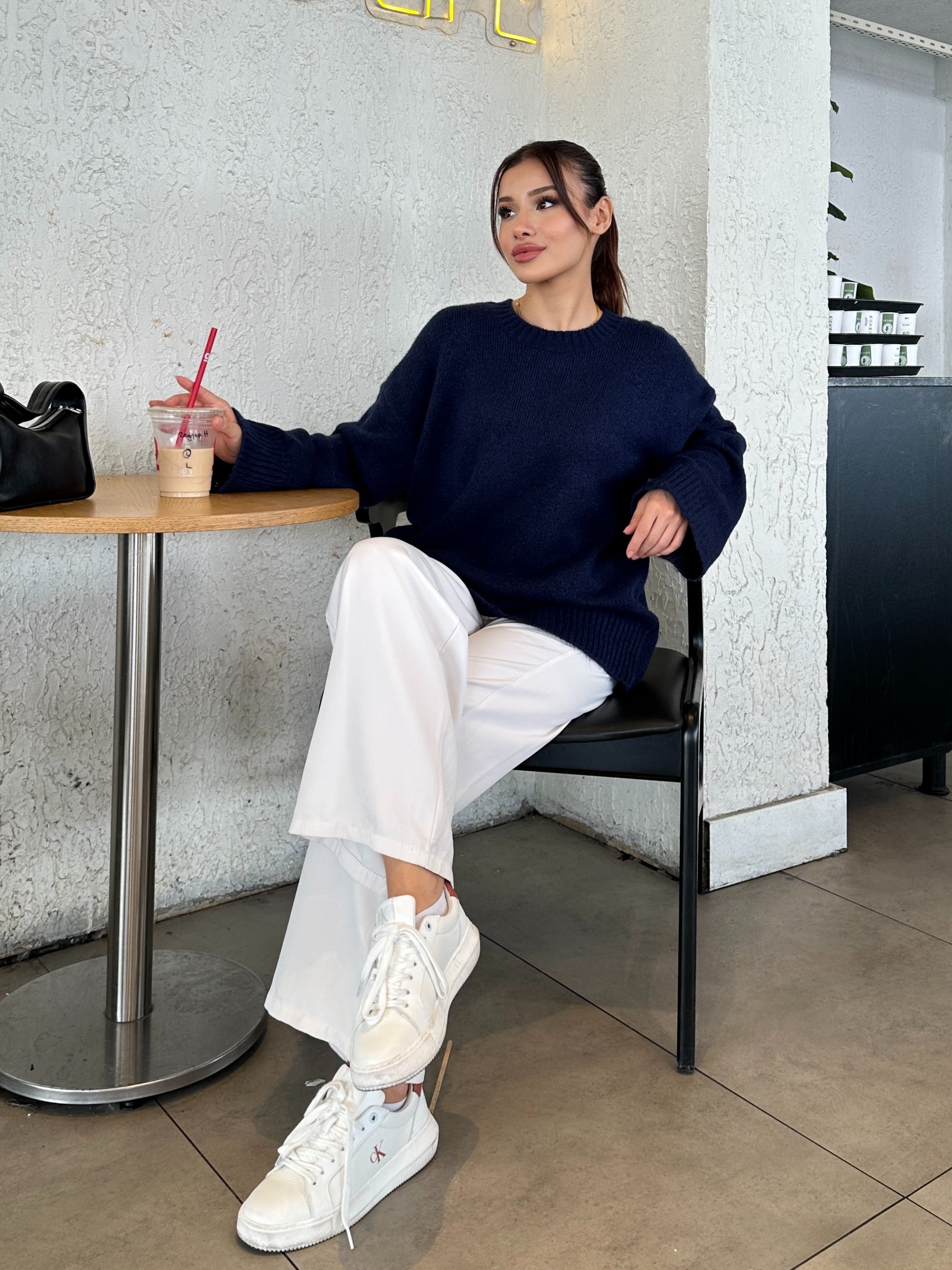 Düşük omuz kesimi ve geniş kolları, kazağa modern ve salaş bir hava katarken, hareket özgürlüğünüzü kısıtlamaz. Lacivert rengi çok yönlü kombinler oluşturmanıza olanak tanır.