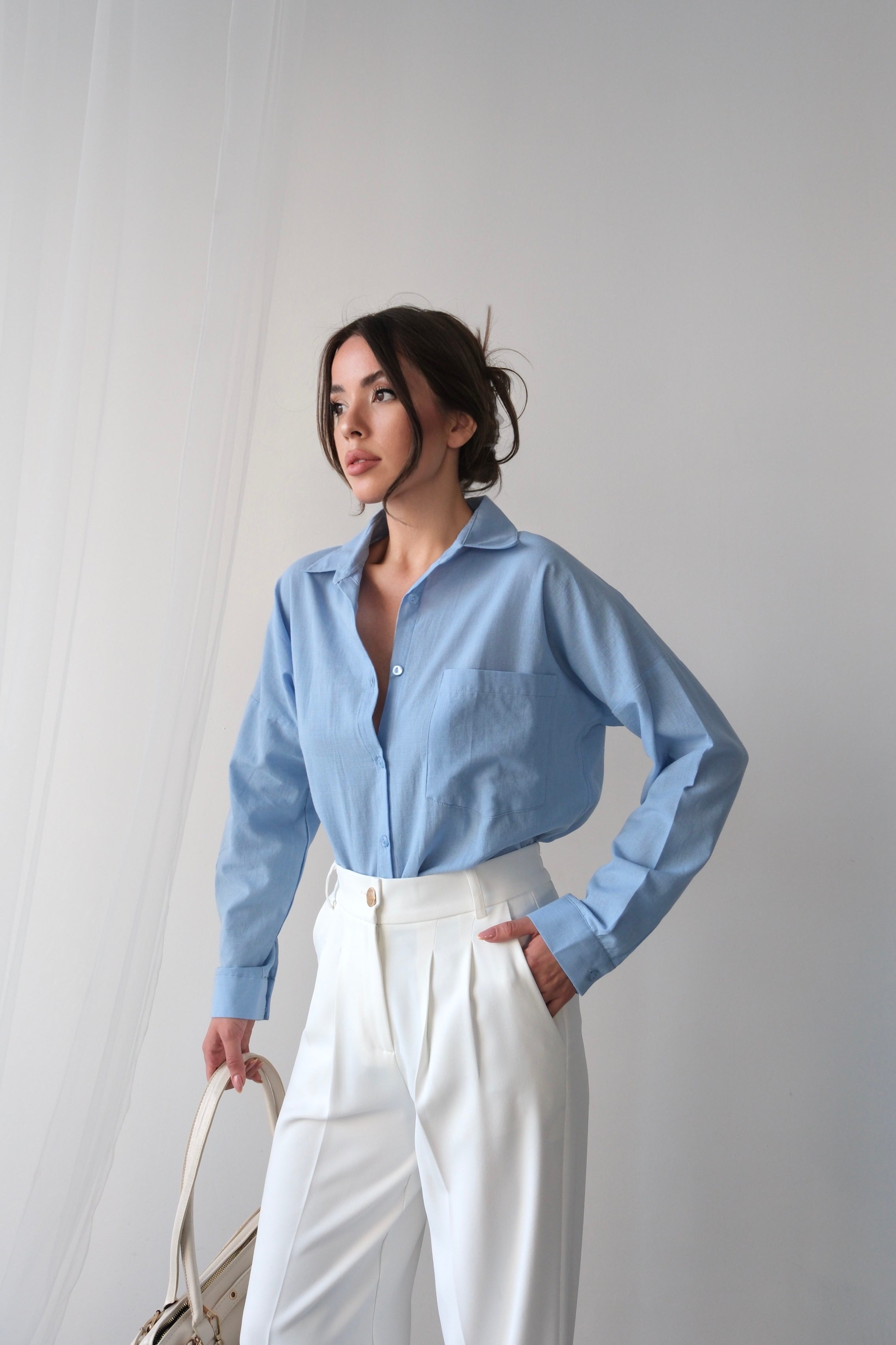 Hafif ve ferah bir görünüm sunan düz renk uzun kollu oversize gömlek, gardırobunuzun rahat ve şık parçalarından biri olmaya aday. Yumuşak dokulu kumaşı sayesinde gün boyu konfor sağlarken, açık mavi rengi huzurlu ve taze bir hava yaratır. Oversize kesimi salaş ve modern bir stil sunarken, uzun kollu tasarımı farklı mevsimlerde kullanım kolaylığı sağlar. Göğüs kısmındaki tek cep detayı ise gömleğe minimal ve şık bir dokunuş katar.