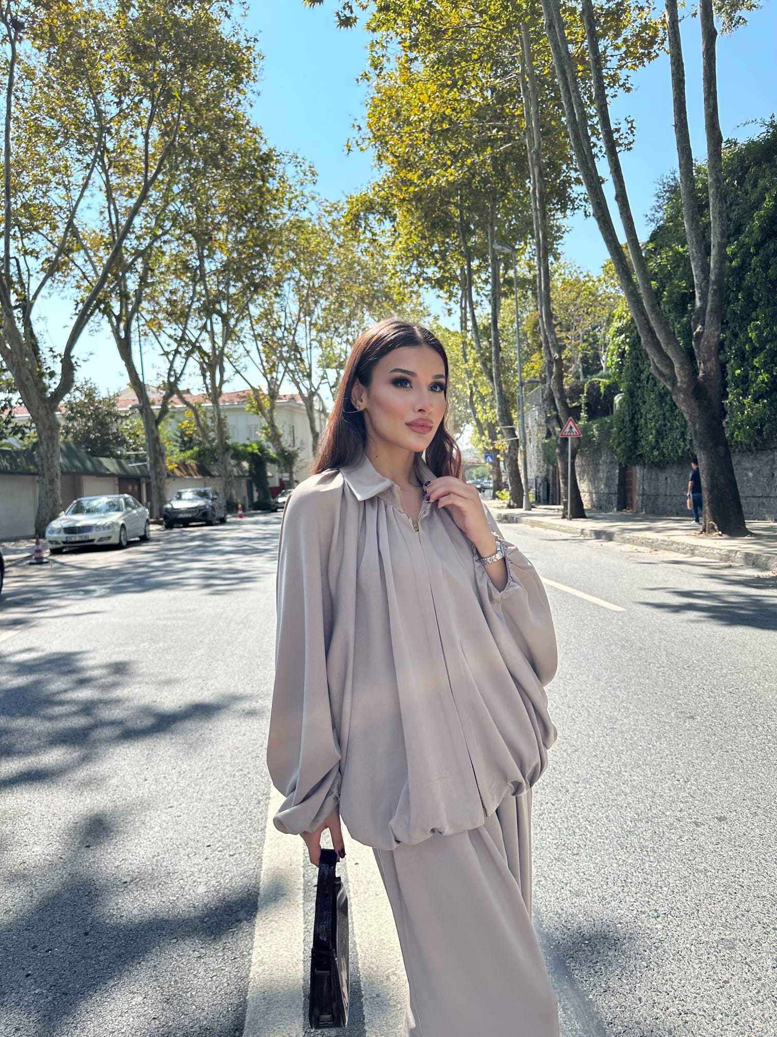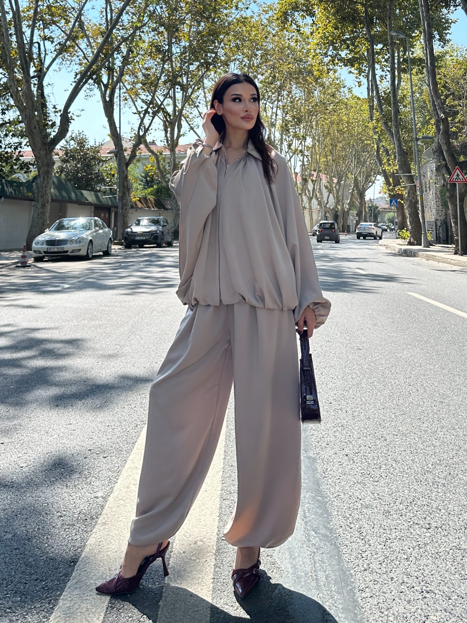 Saten Büzgülü Pileli Bumber Ceket Pantolon Takım 3015 - Bej