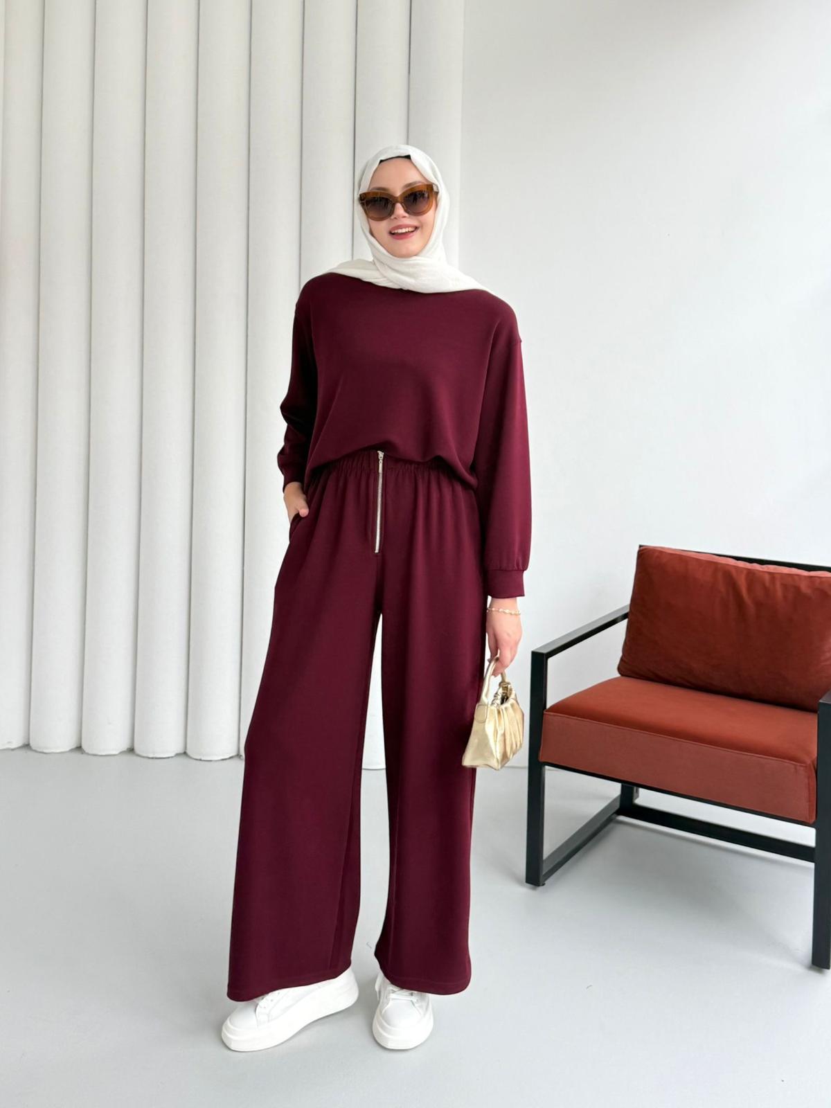 Sırtı Fermuar Detaylı Tunik ve Geniş Paça Pantolonlu Takım 8916 - Bordo