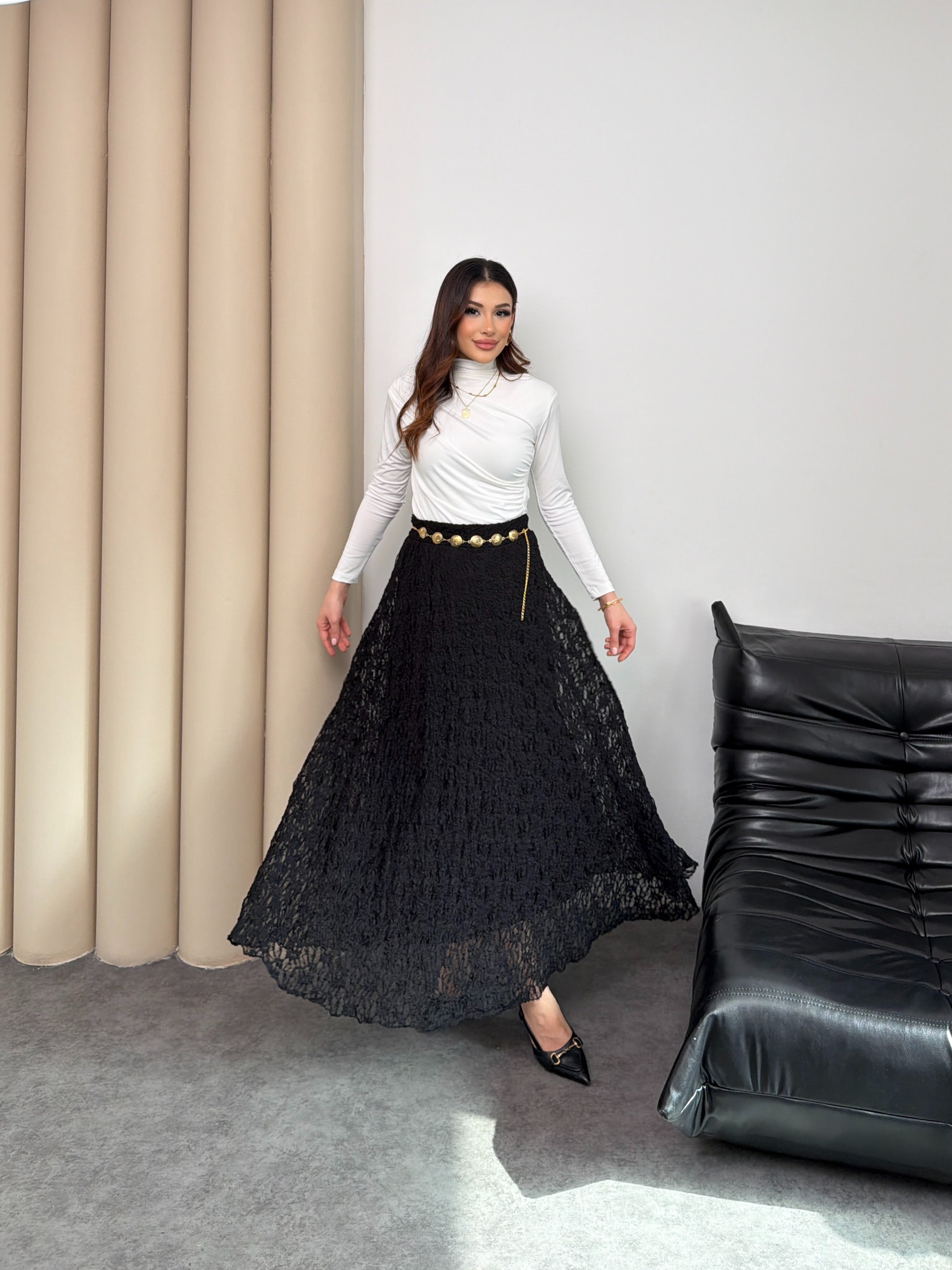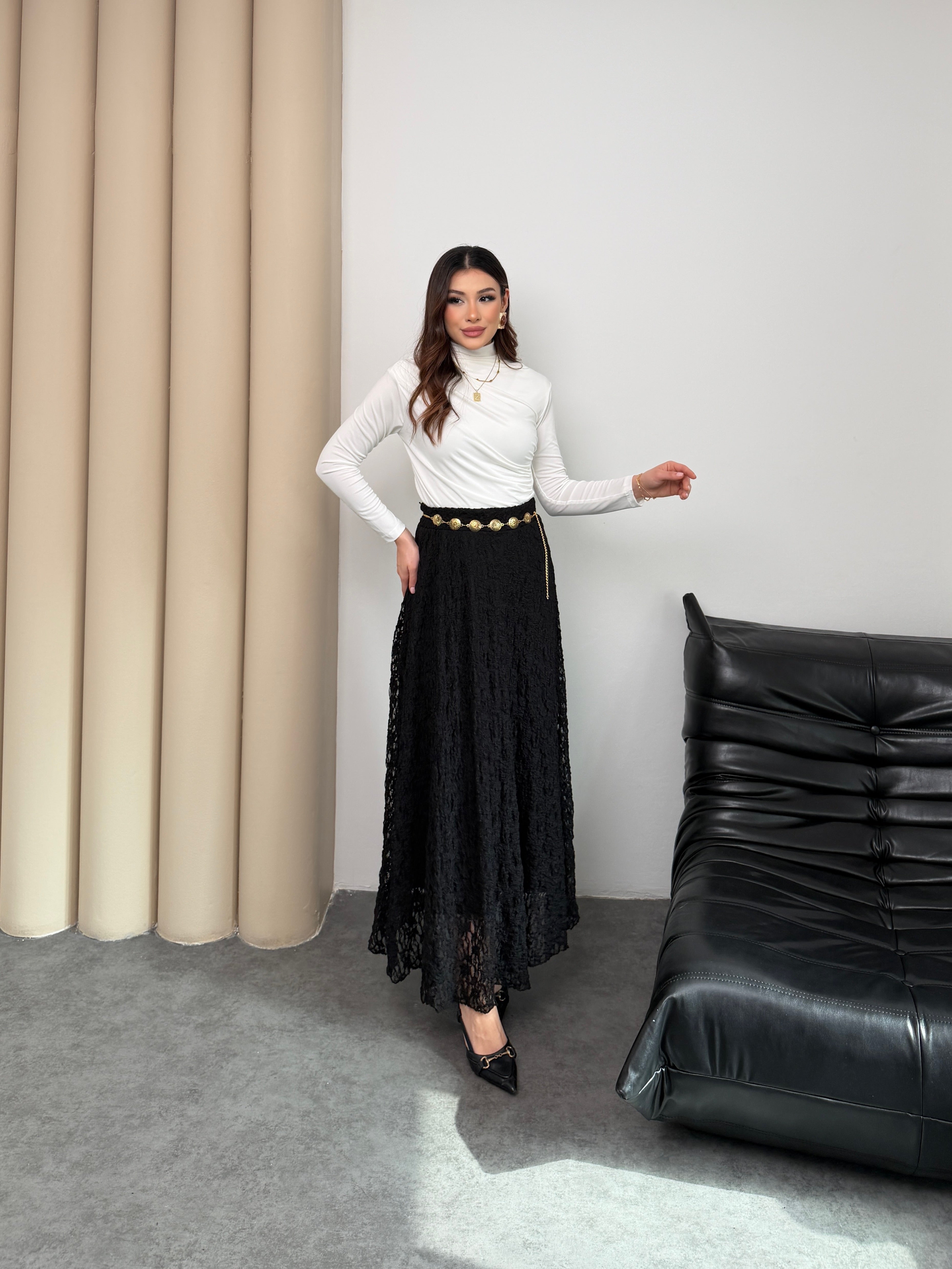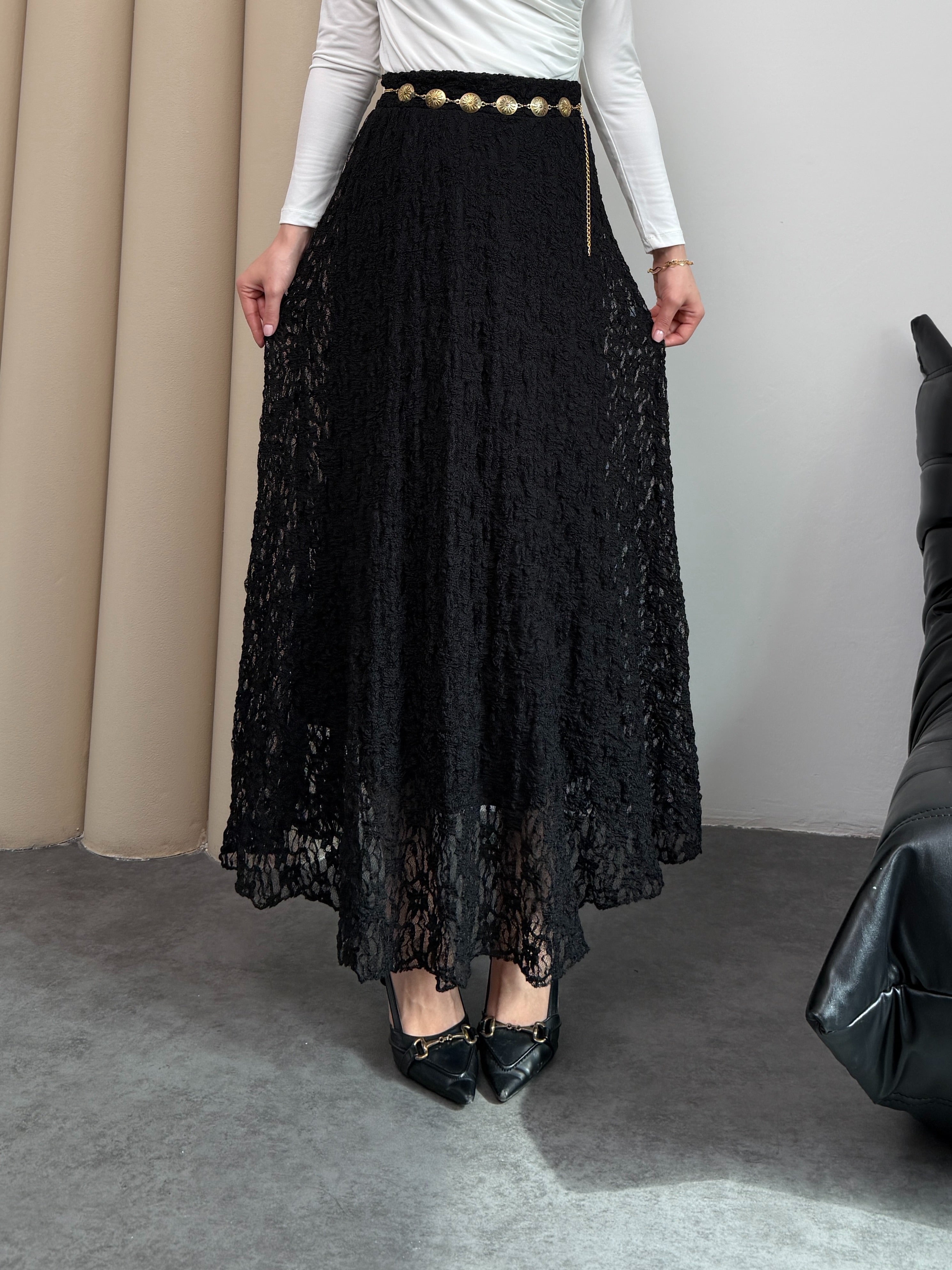 Zamansız Şıklık ve Konfor Bir Arada! Özel ajurlu dantel dokusuyla hareket kazanan bu siyah etek, gardırobunuzun en joker parçası olacak. A kesim (kloş) formu sayesinde zarif bir silüet çizerken, beli lastikli yapısıyla gün boyu konforlu bir kullanım sunar.