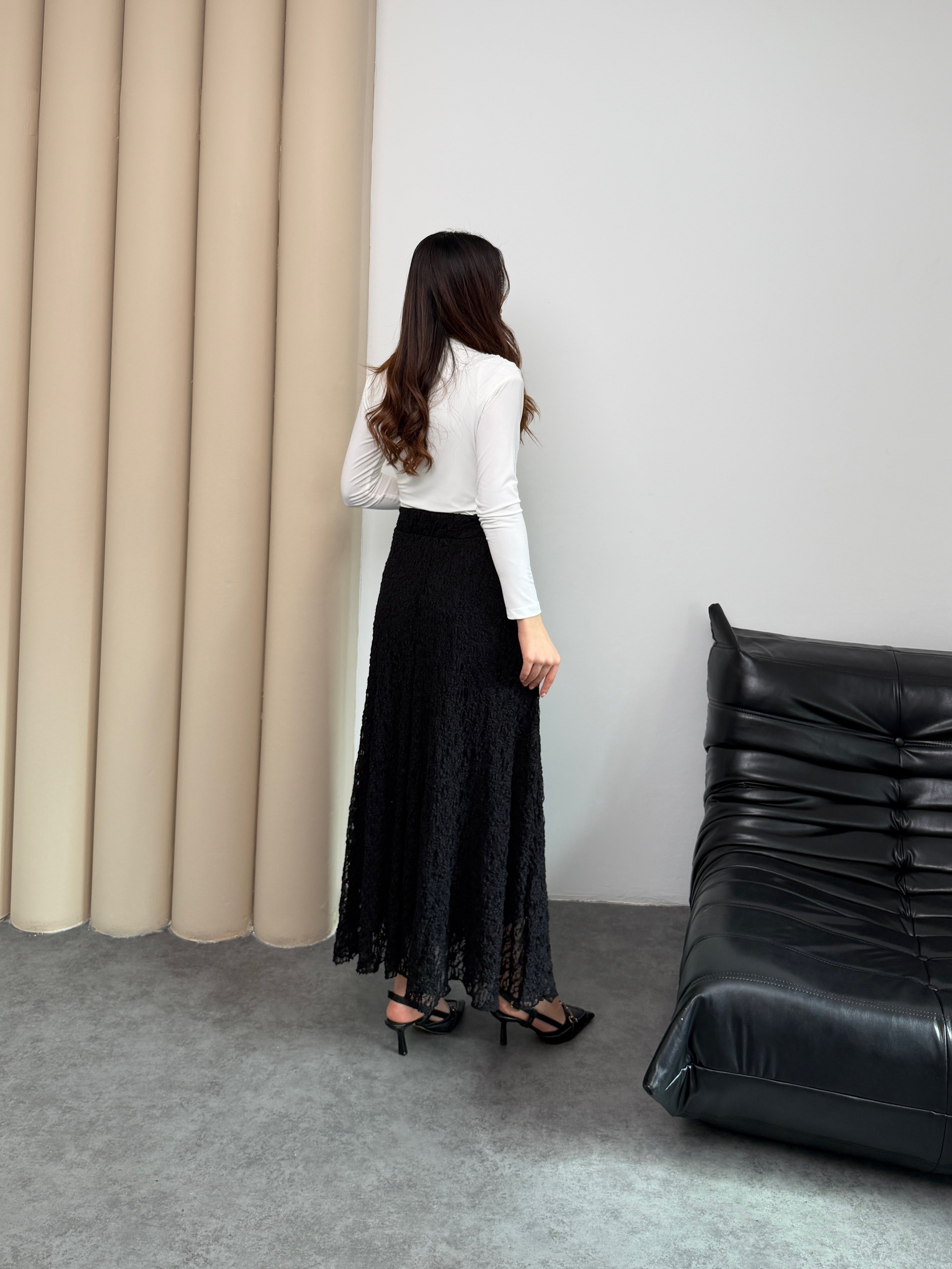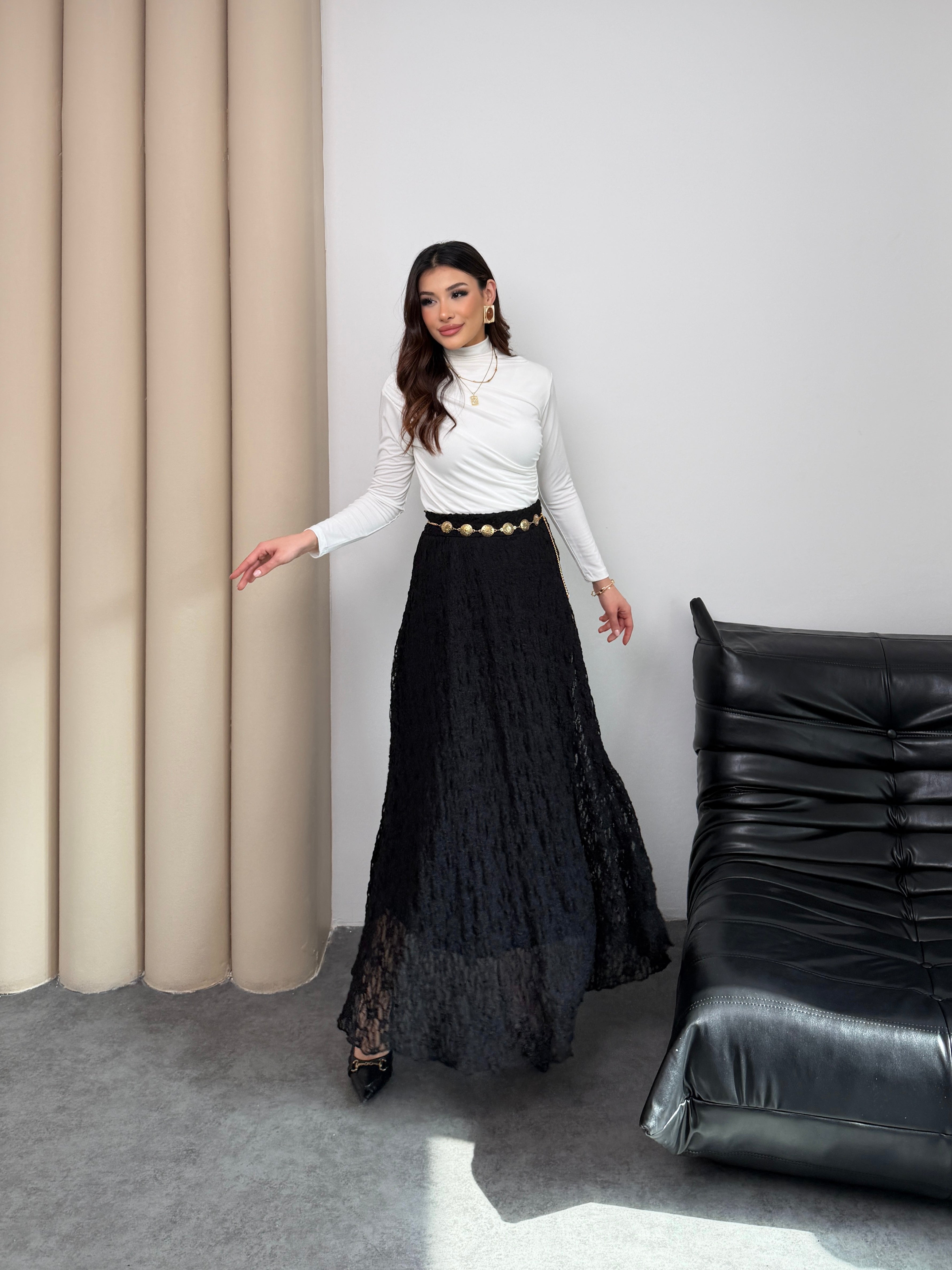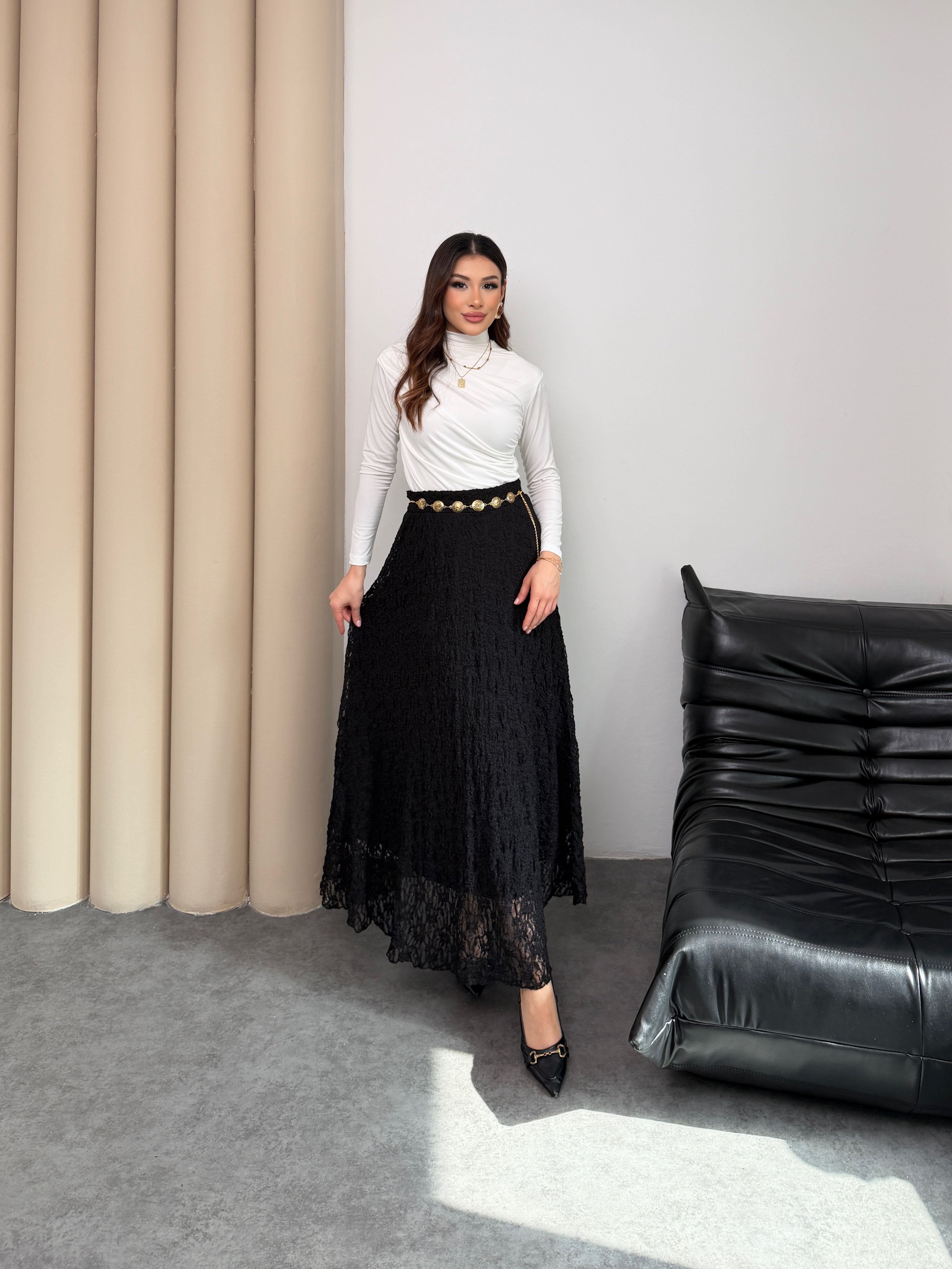 Zamansız Şıklık ve Konfor Bir Arada! Özel ajurlu dantel dokusuyla hareket kazanan bu siyah etek, gardırobunuzun en joker parçası olacak. A kesim (kloş) formu sayesinde zarif bir silüet çizerken, beli lastikli yapısıyla gün boyu konforlu bir kullanım sunar.