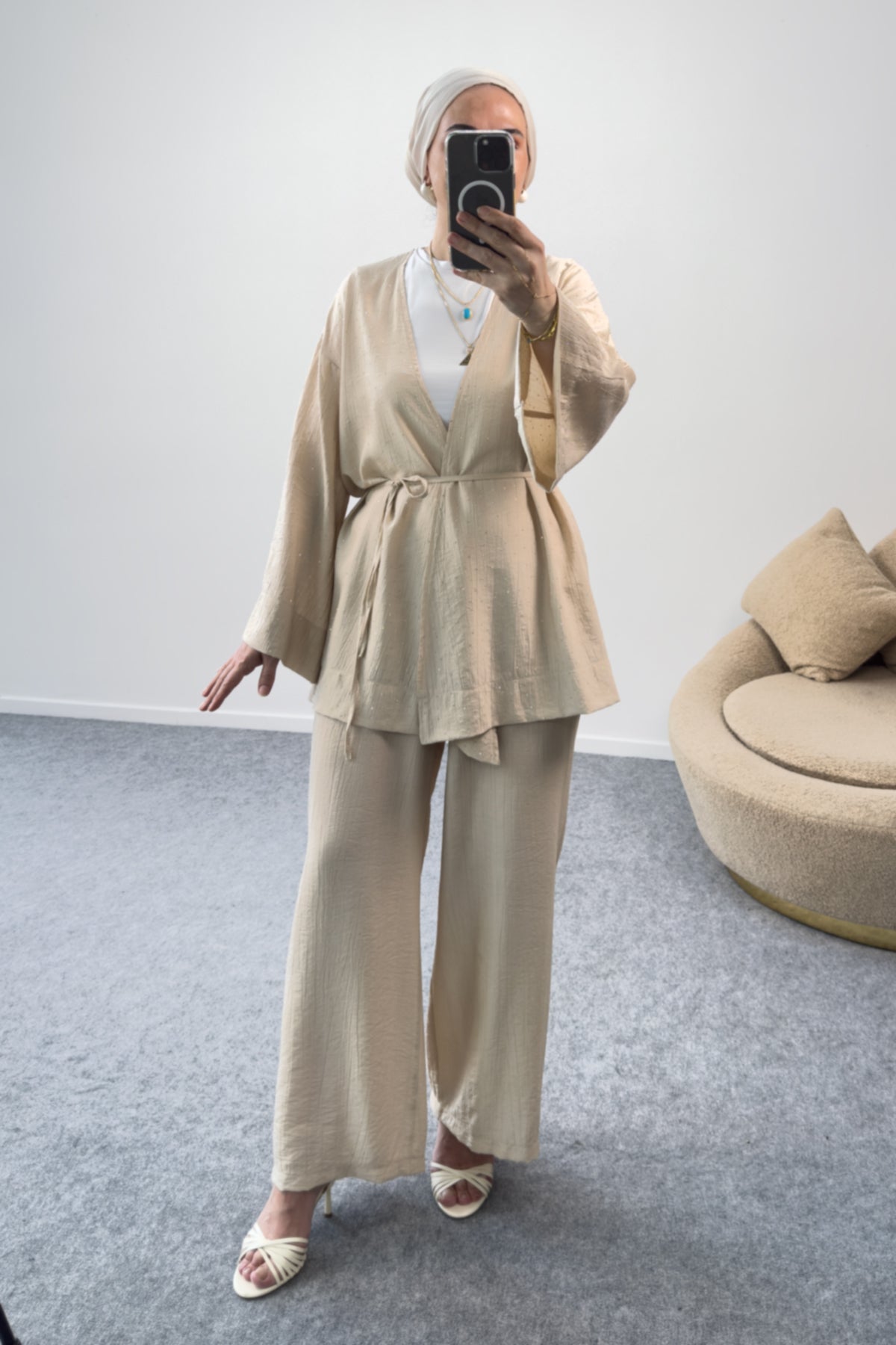 Taş Detaylı Kuşaklı Kimono Ceket ve Geniş Paça Pantolonlu İkili Takım 8869 - Bej