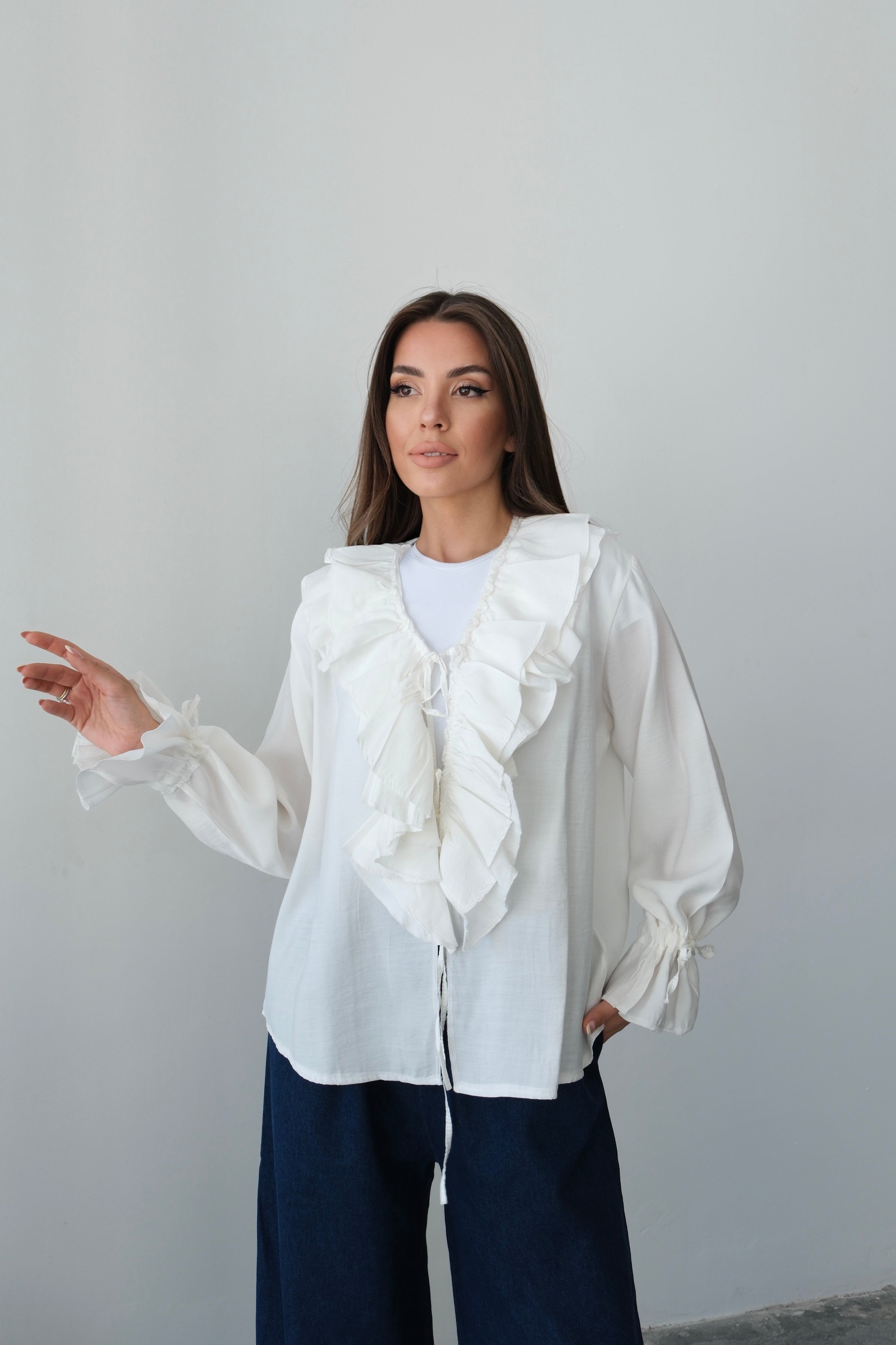 Fırfırlı Bağlama Detaylı Uzun Kollu Bluz - Beyaz