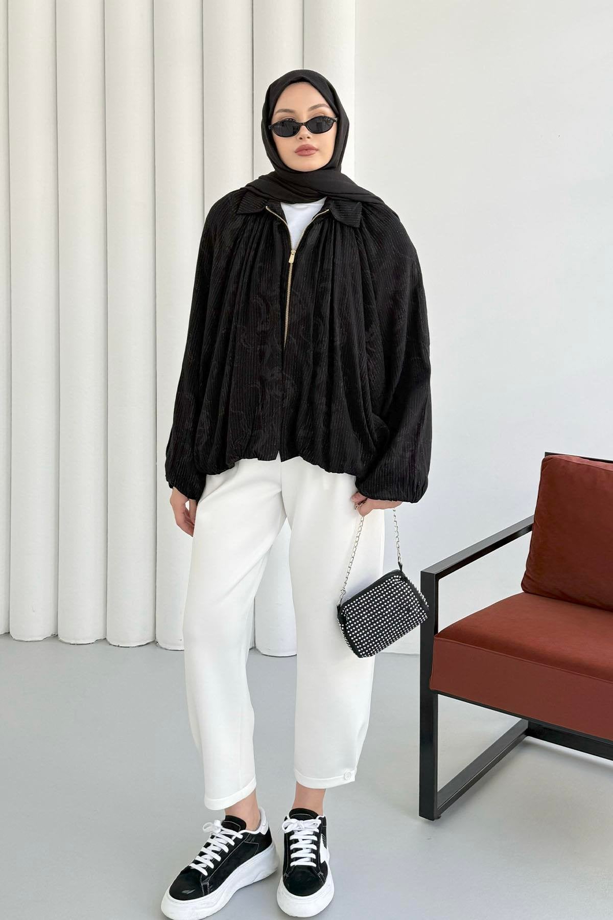 Yarasa Kol Simli Jakarlı Bomber Ceket 3024 - Siyah