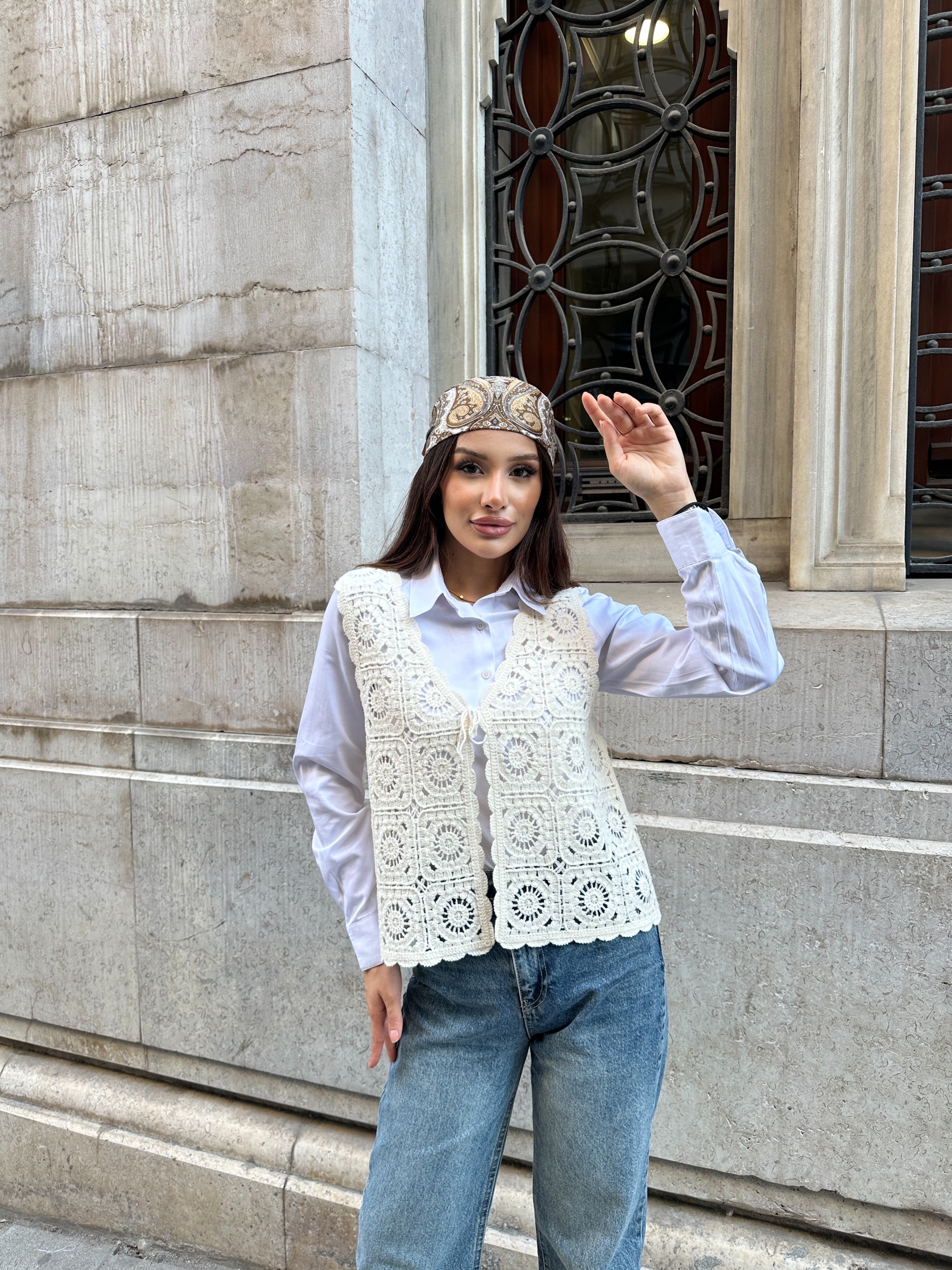 HatunAtila Çiçek Desenli Akrilik Süzene Yelek 5198 - Ekru