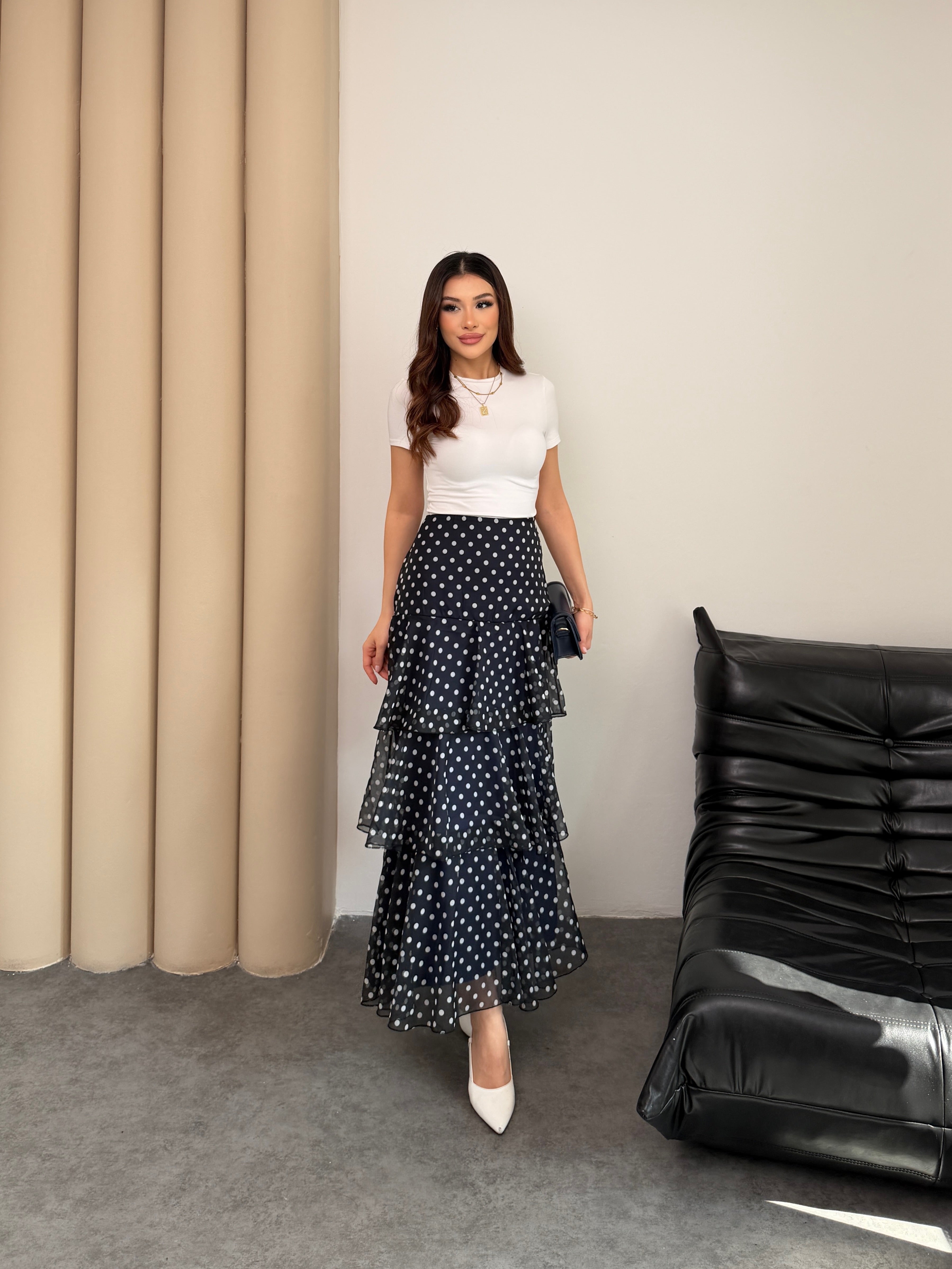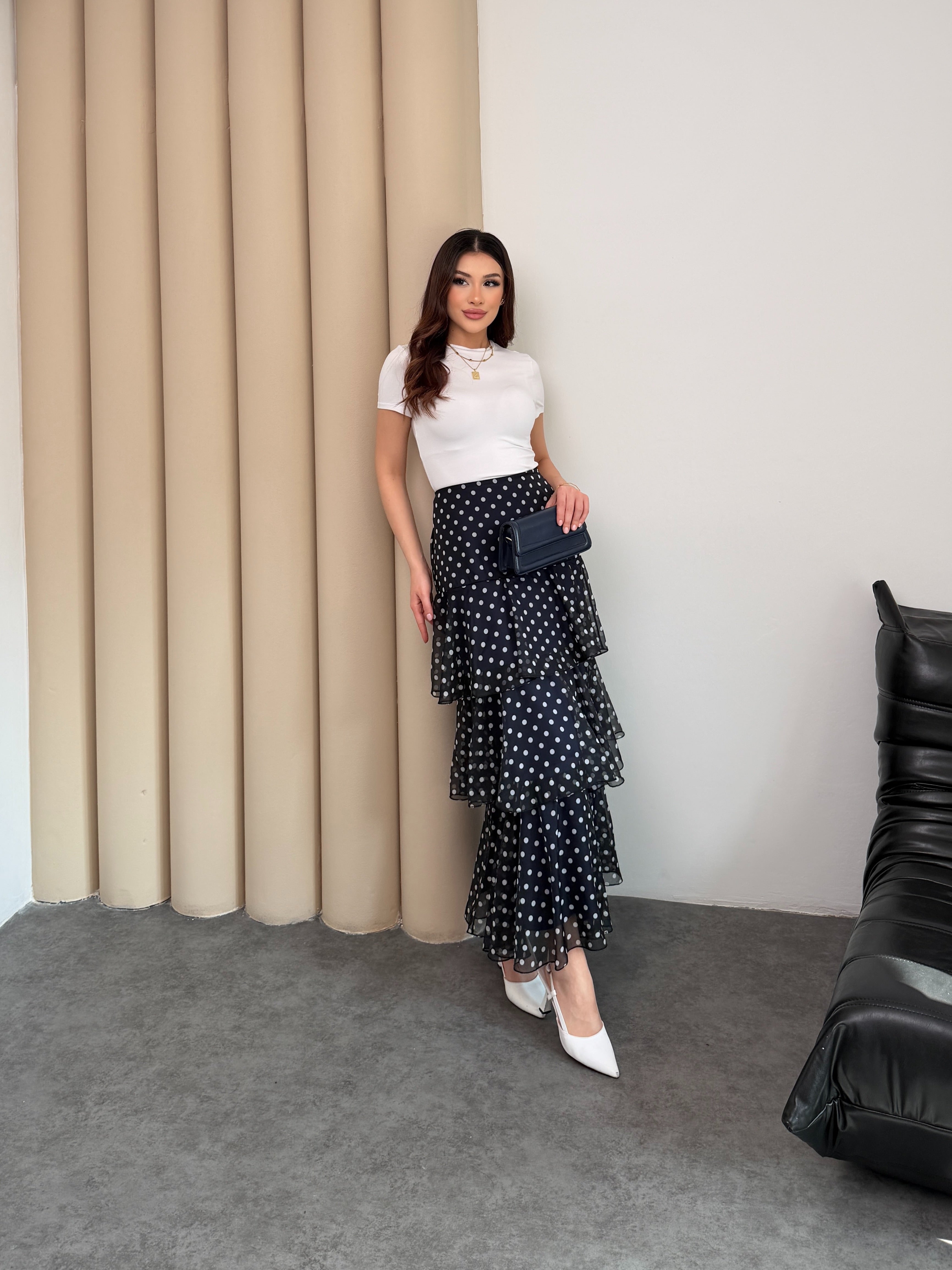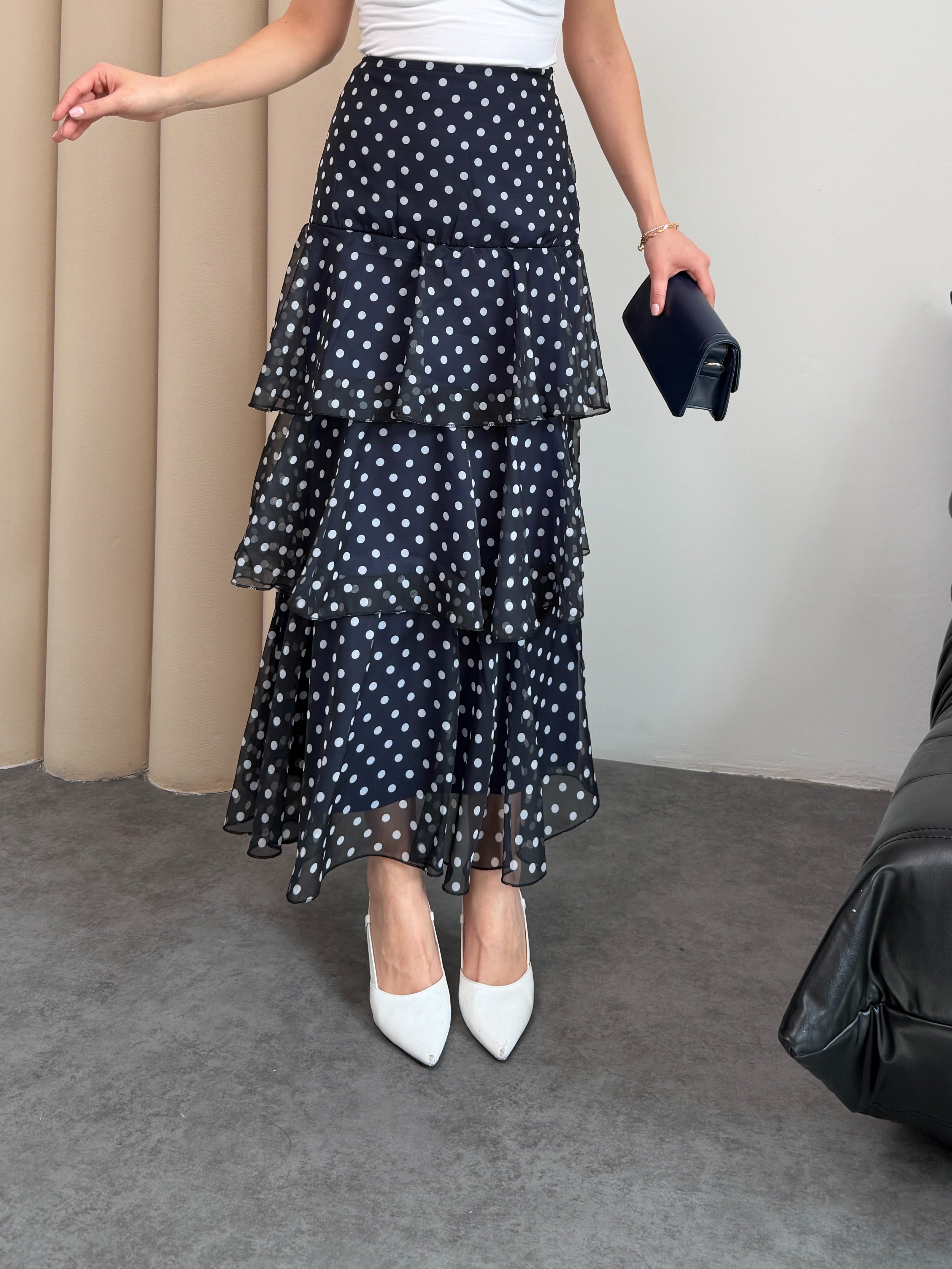Puantiyeli Kat Kat Fırfırlı Şifon Maxi Etek
