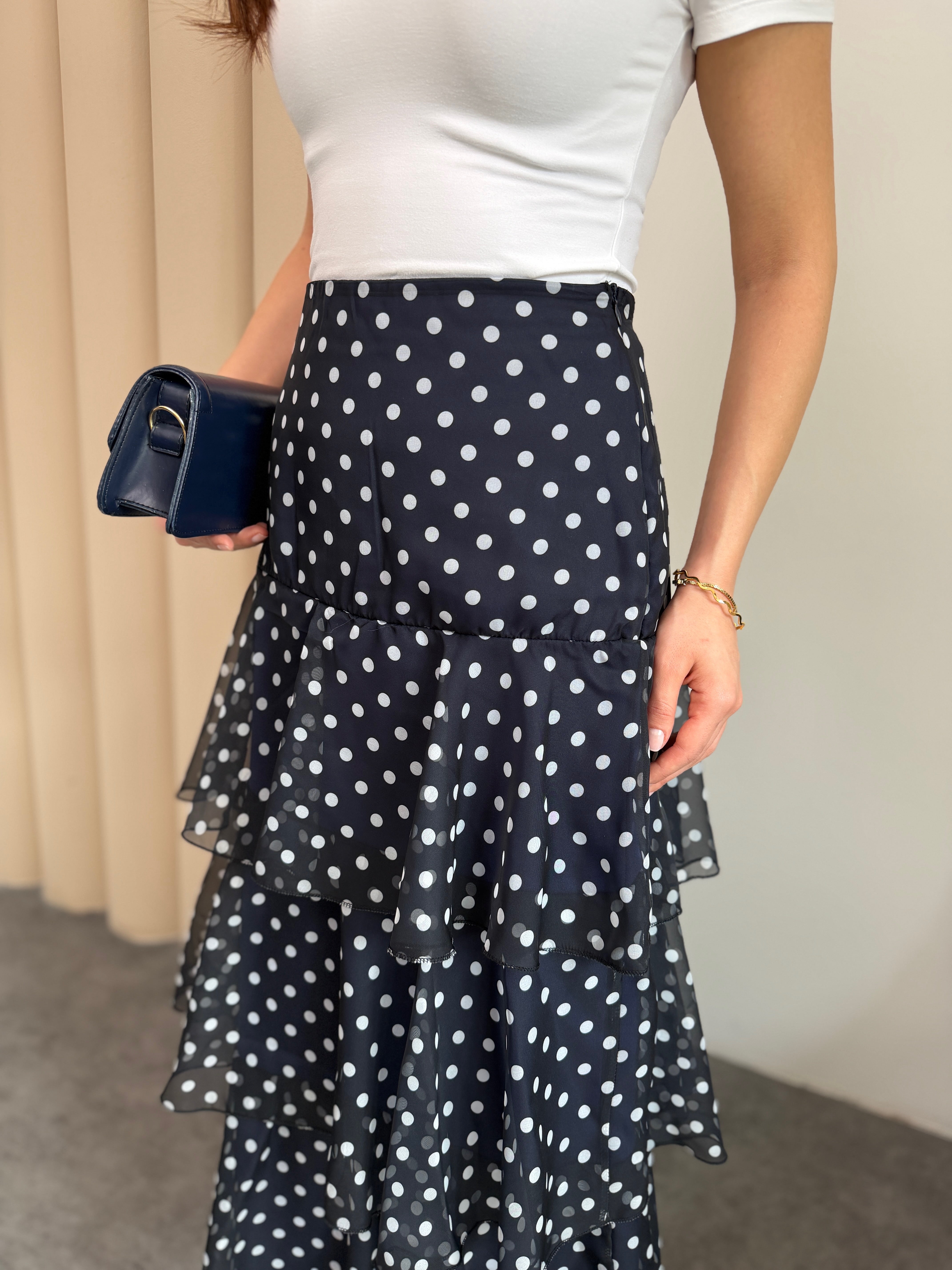 Lacivert Astarlı Puantiyeli Kat Kat Fırfırlı Şifon Maxi Etek 5295