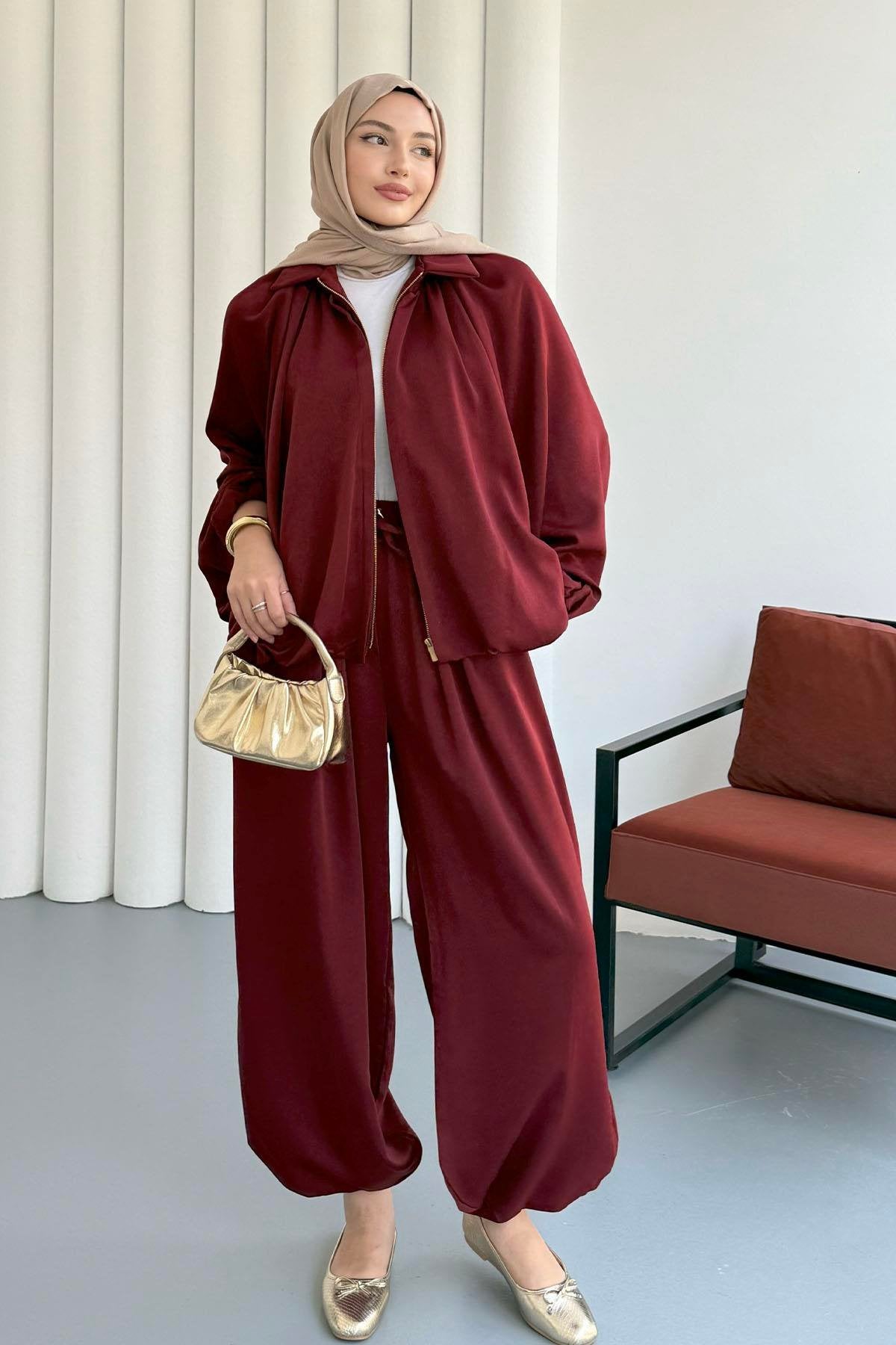 Saten Büzgülü Pileli Bumber Ceket Pantolon Takım 3015 - Bordo